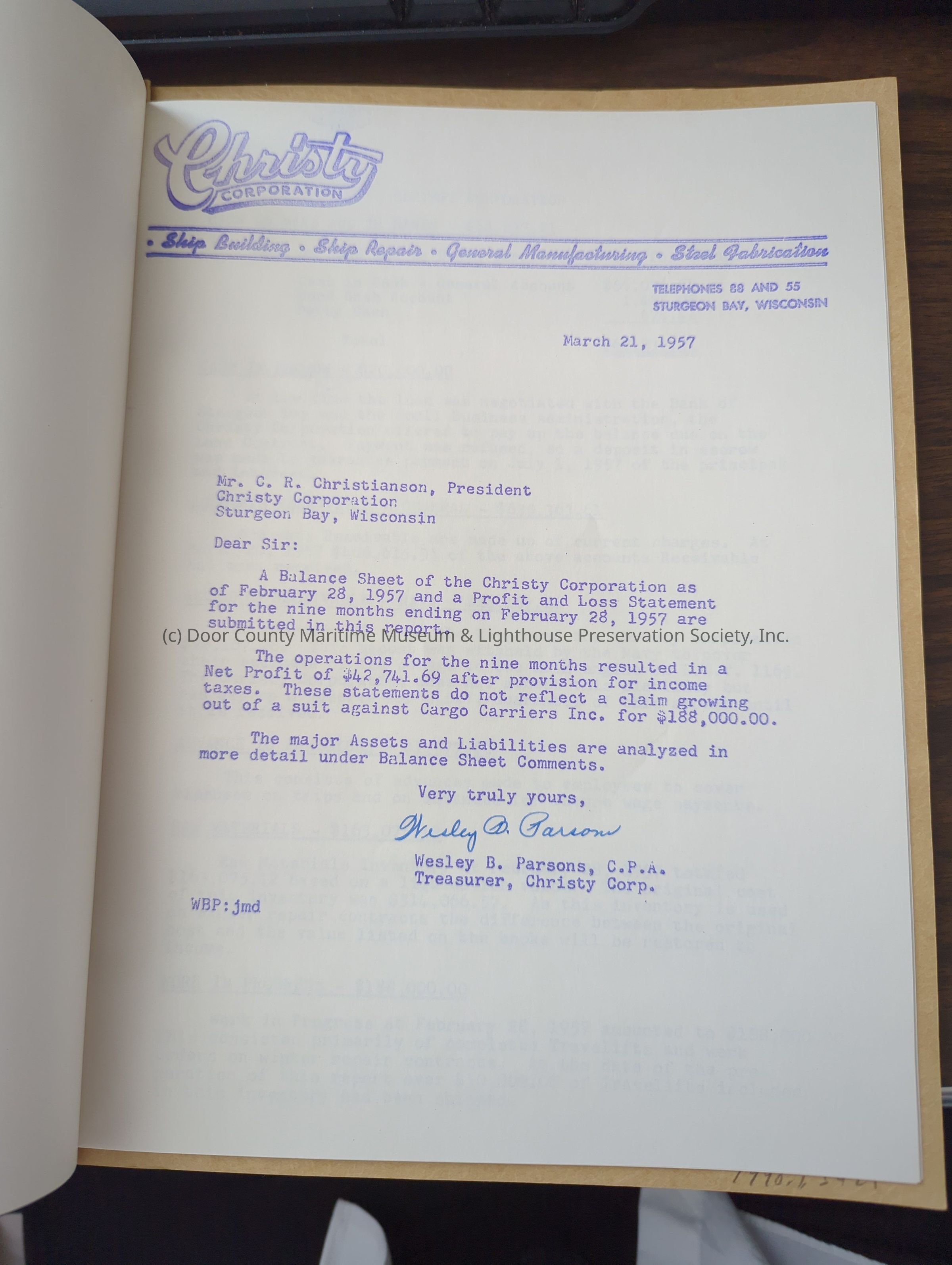 Christy Corp Nine Month Profit Ledger 1956-1957
