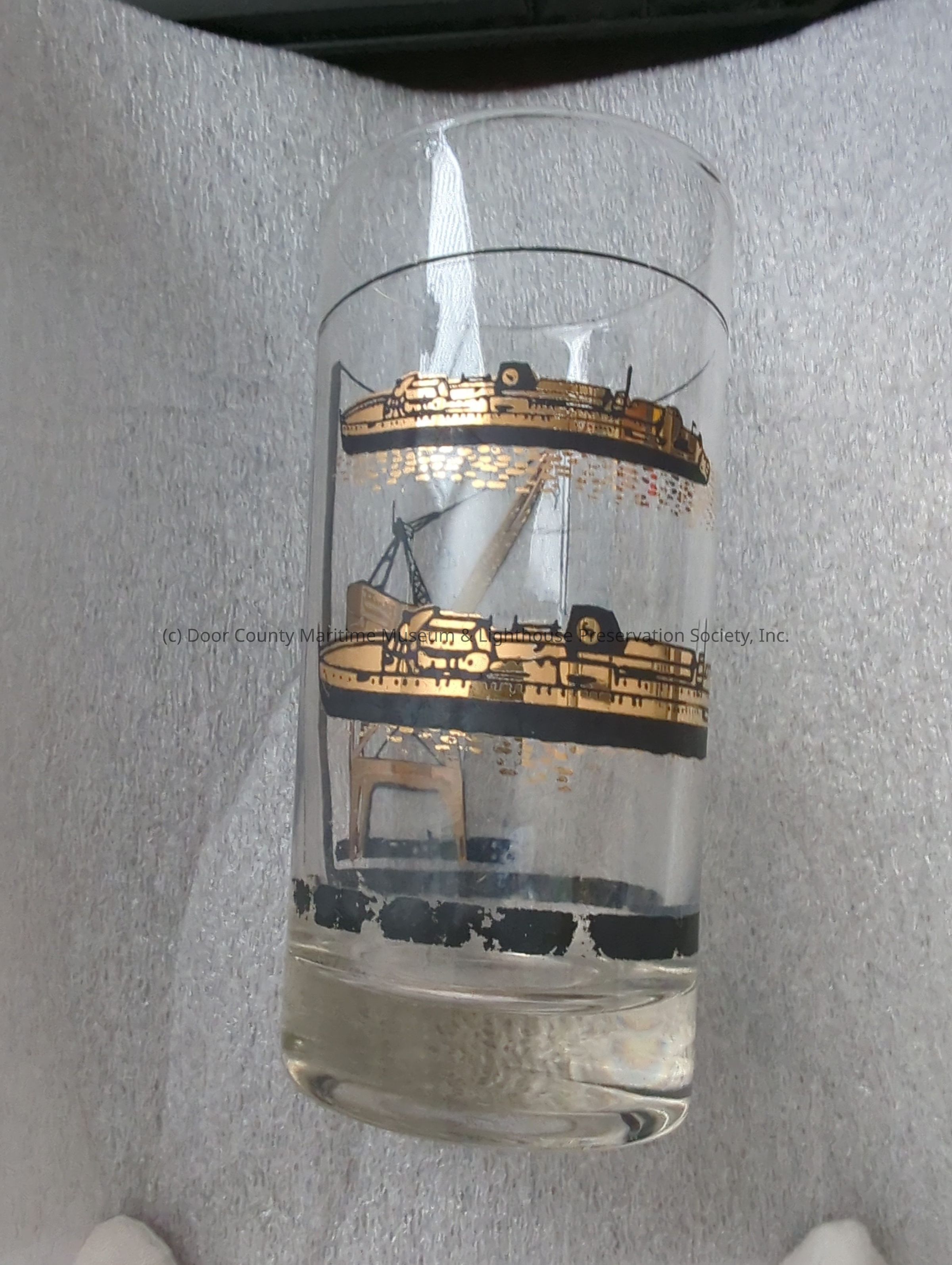 Glass with pictures of cranes and two ships