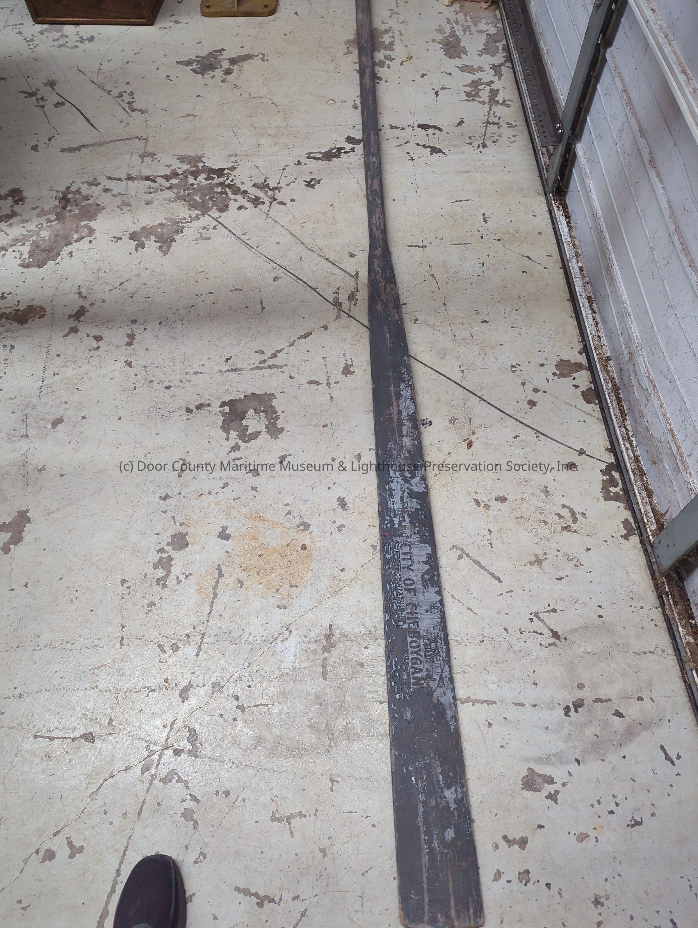 Grey painted wooden oar with black text "City of Cheboygan"