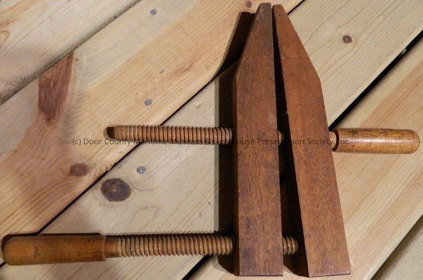 Two 12" wood clamps; two 13" wood "handles" with corkscrew-like rods holding clamps together through holes in clamps; brown varnish.Location