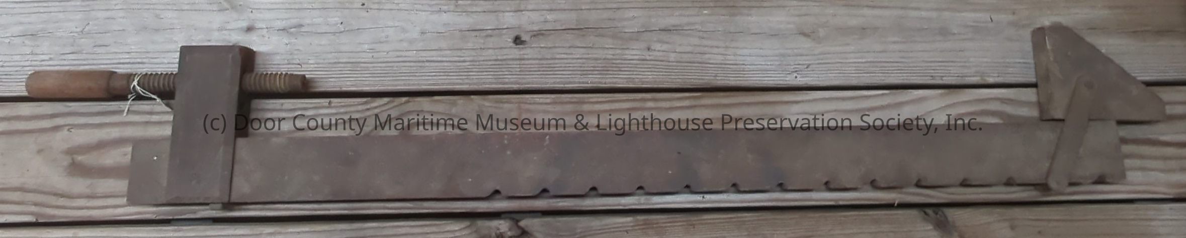 Brown wood and metal clamp. Threaded wood handle. Notches in bottom of wood bar act as lock for adjustable locking stop on end of bar