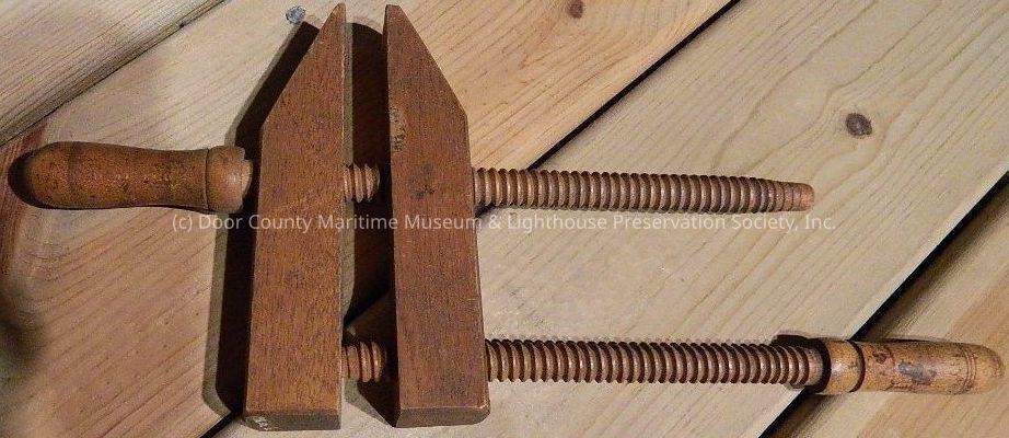 Two 6 1/4" wood clamps; two 11 1/2" wood "handles" with corkscrew-like rods holding clamps together through holes in clamps; brown varnish.Location