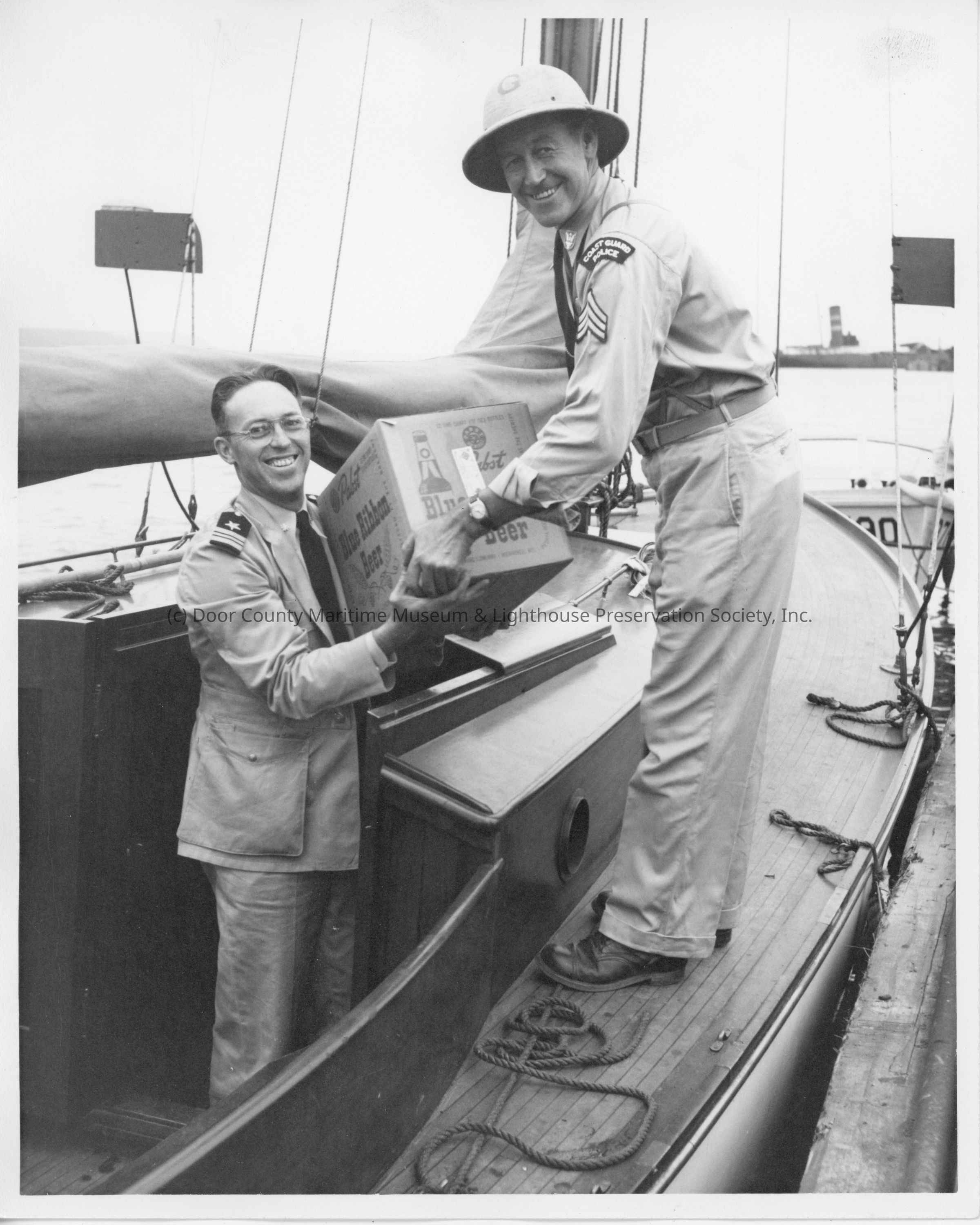Coast Guard police loading a case of Pabst Blue ribbon Beer on Half MoonEntry/Object ID