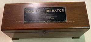Brown wooden varnished case with black plastic on front cover with white print. Cargo vessel Coast Liberator. Two gold metal fasteners attached to back. Gold metal latch on front. Block “legs” on each corner on bottom. Green felt padding on legs. “Cargo Vessel Coastal Liberator Built For The U.S Maritime Commission By LEATHEM D. SMITH SHIPBUILDING CO. Sturgeon Bay, Wisconsin LAUNCHED AUGUST 5TH, 1945 Sponsored by MRS. A. B. SMITH”