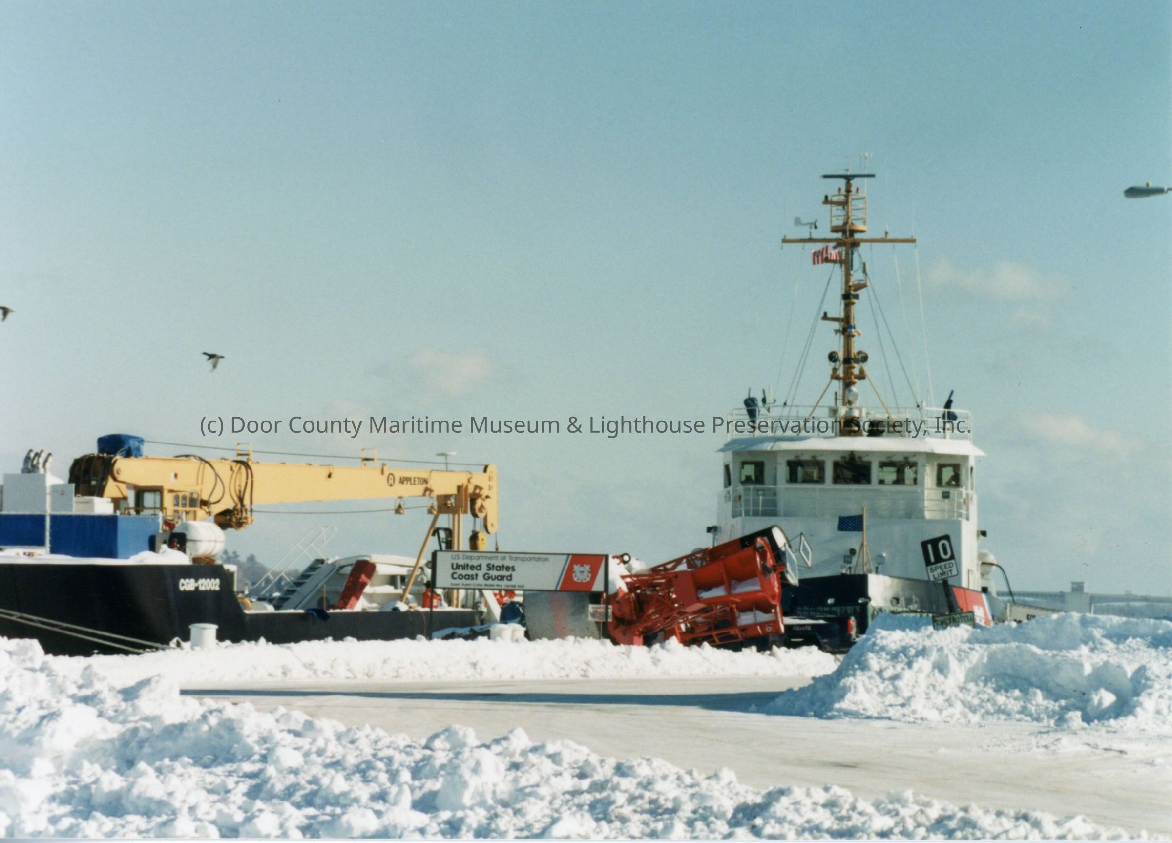 Coast Guard cutter at Sturgeon Bay shipyard during winter. Coast Guard sign in center. Barge with crane on left side. Clouds in the sky. "10" on board of the cutterLocation