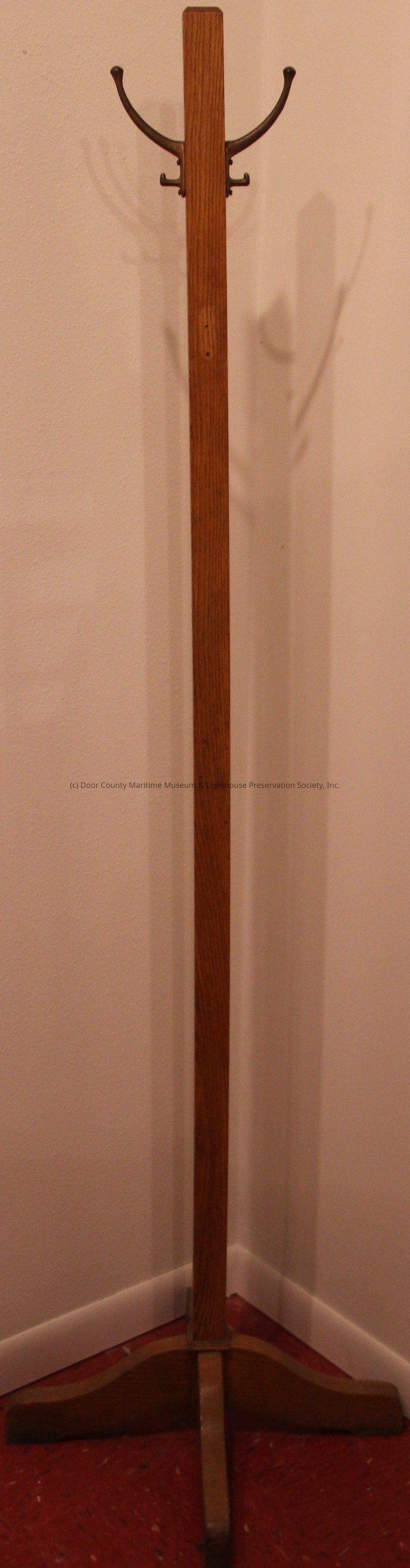 A 1 3/4" square varnished wood post is set in a base of four legs, slightly curved; two metal hooks on opposite sides; one hook goes up and there is a small hook perpendicular to the plate beneath the larger hook; there are screw holes where plate and hooks on opposing sides have been removed; a metal band with screws holds the base together.Location