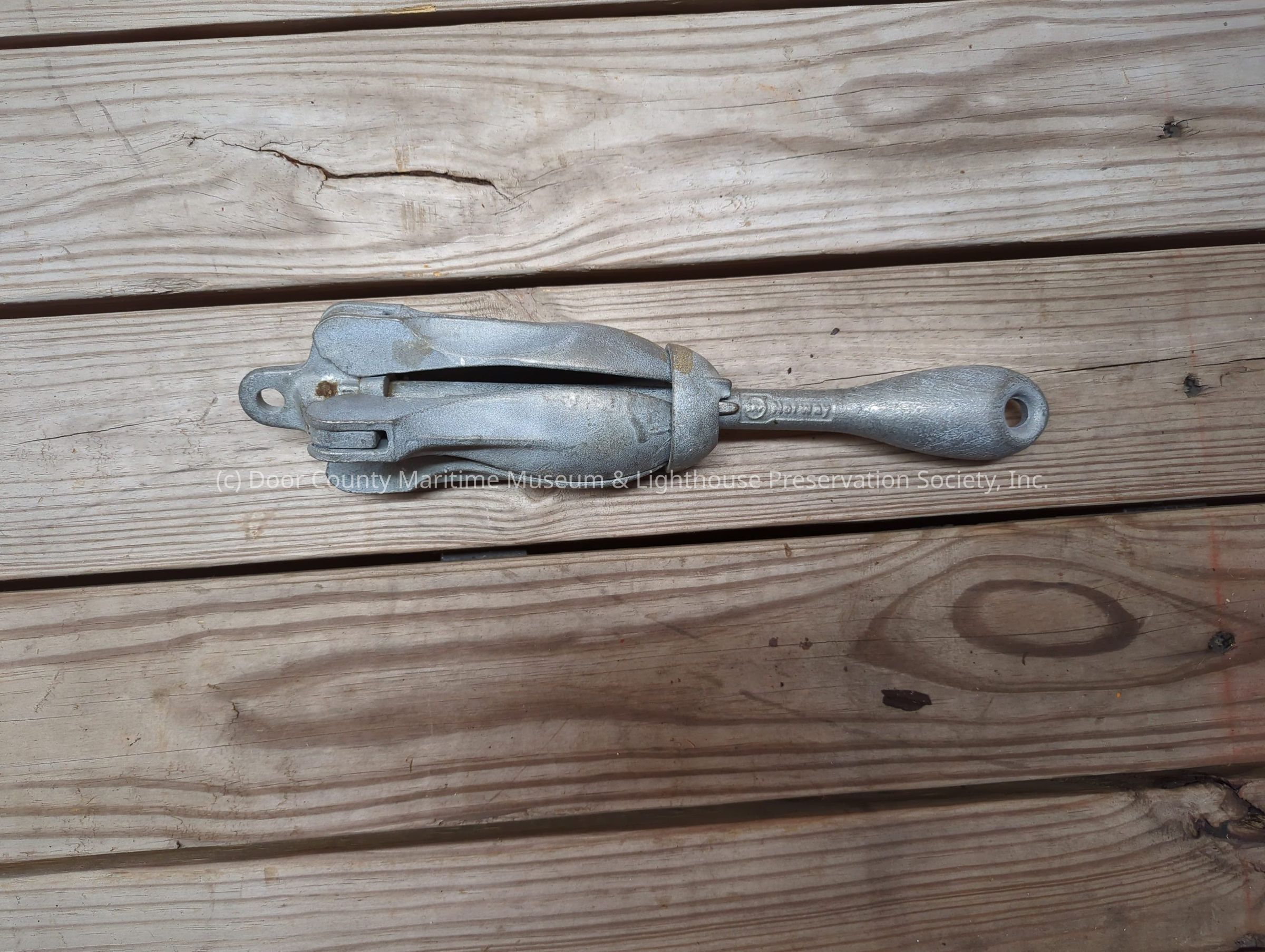 Silver metal anchor. Four anchor arms. "Norway". Round holes on each end. Sliding round mechanism to hold arms in place