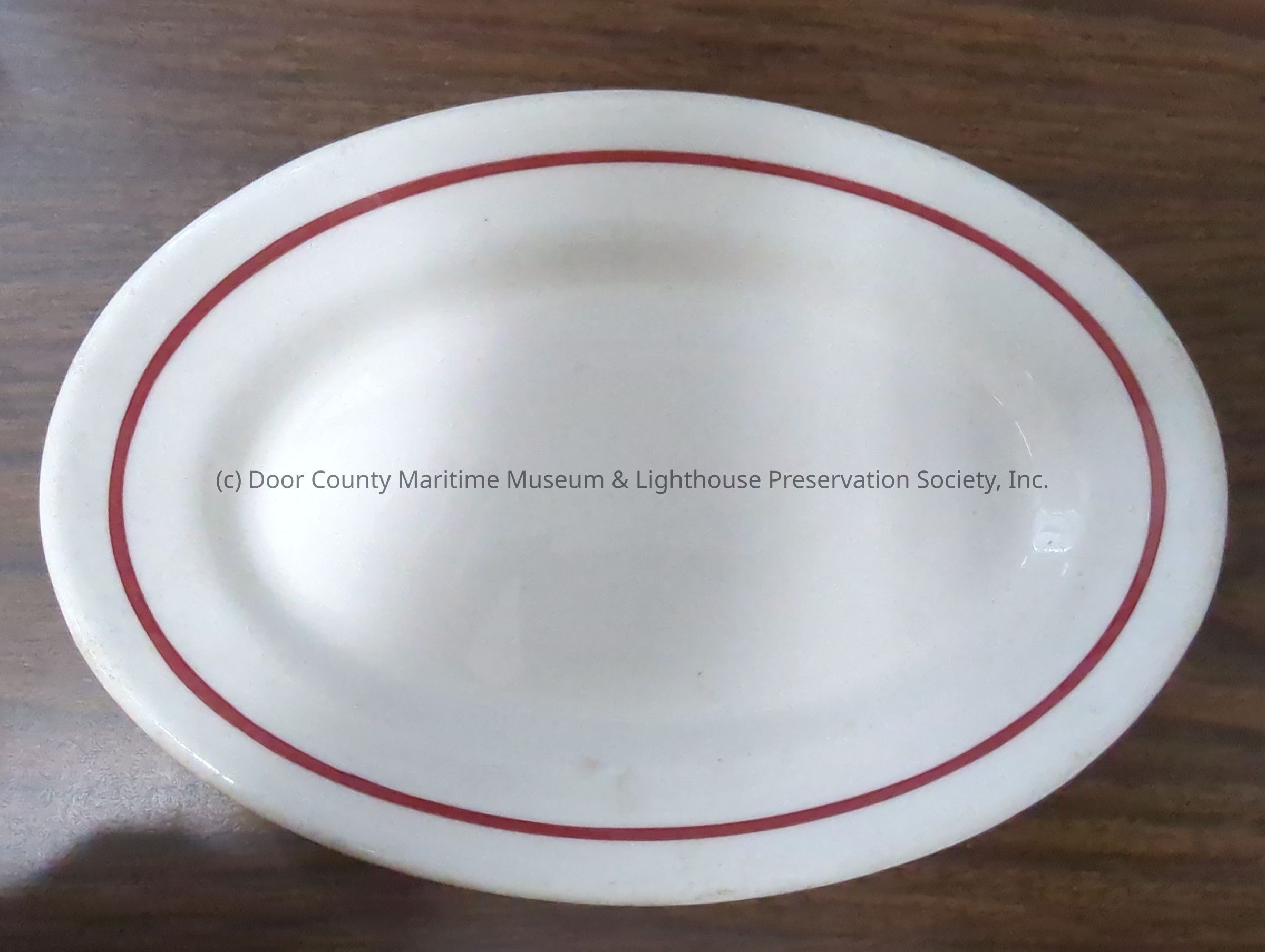White oval dish with a depression in the center. Red line around the rim of the dish. Maker's mark on the reverseLocation