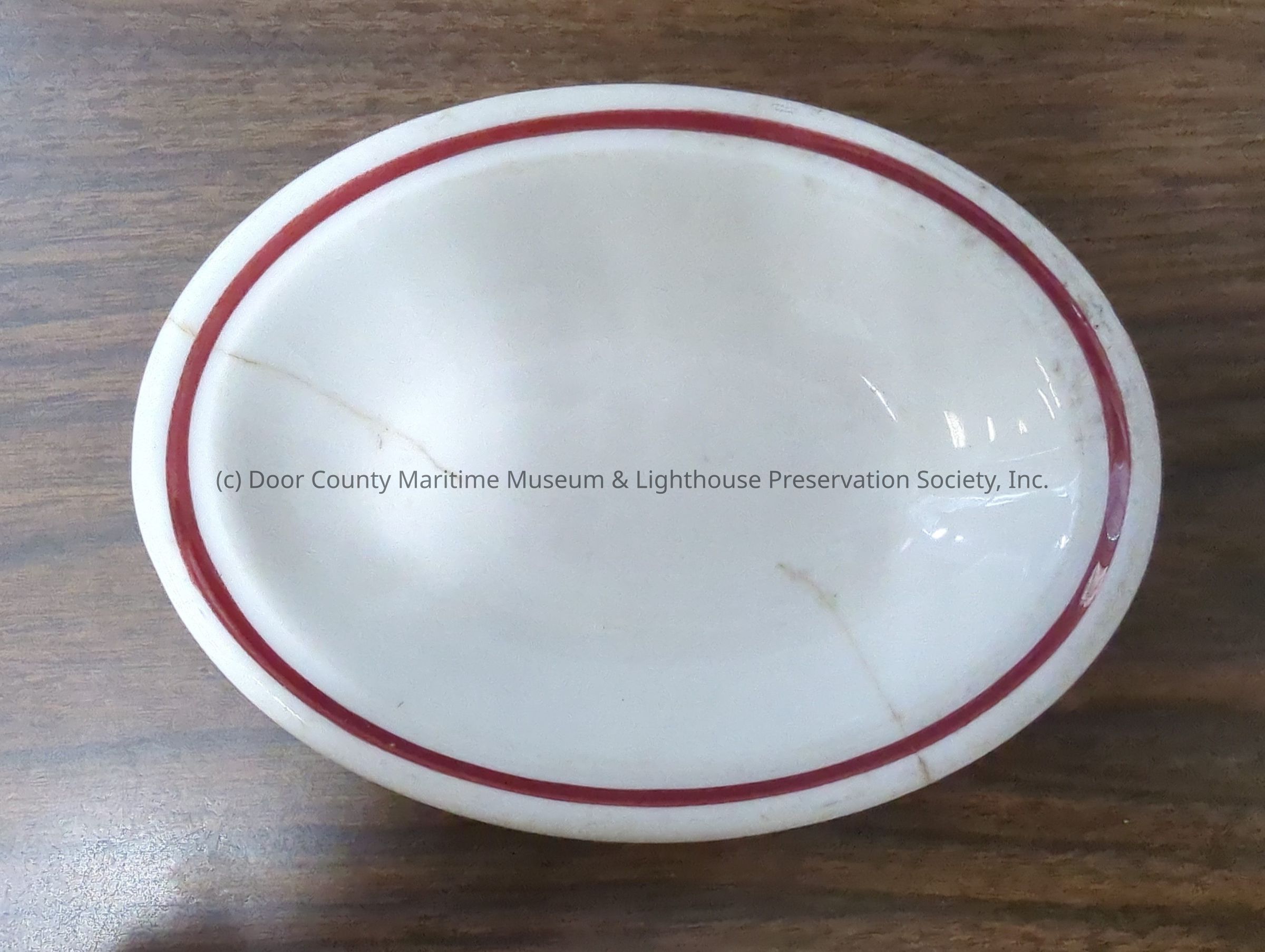 Small white oval porcelain dish. Red line around rim. Two cracks on face of object. Maker's mark printed on object's reverseLocation