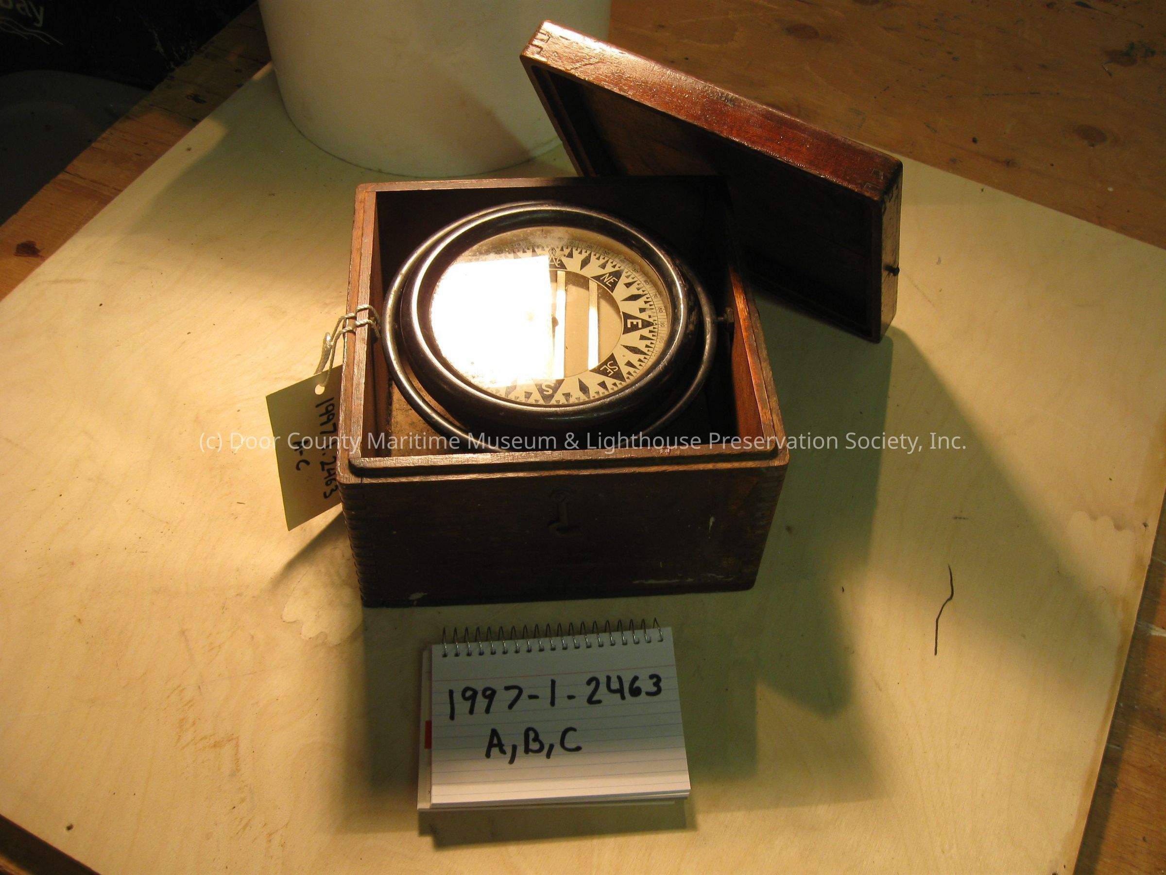 Black finish white card w/black writing. In dark wooden case w/removable lid.