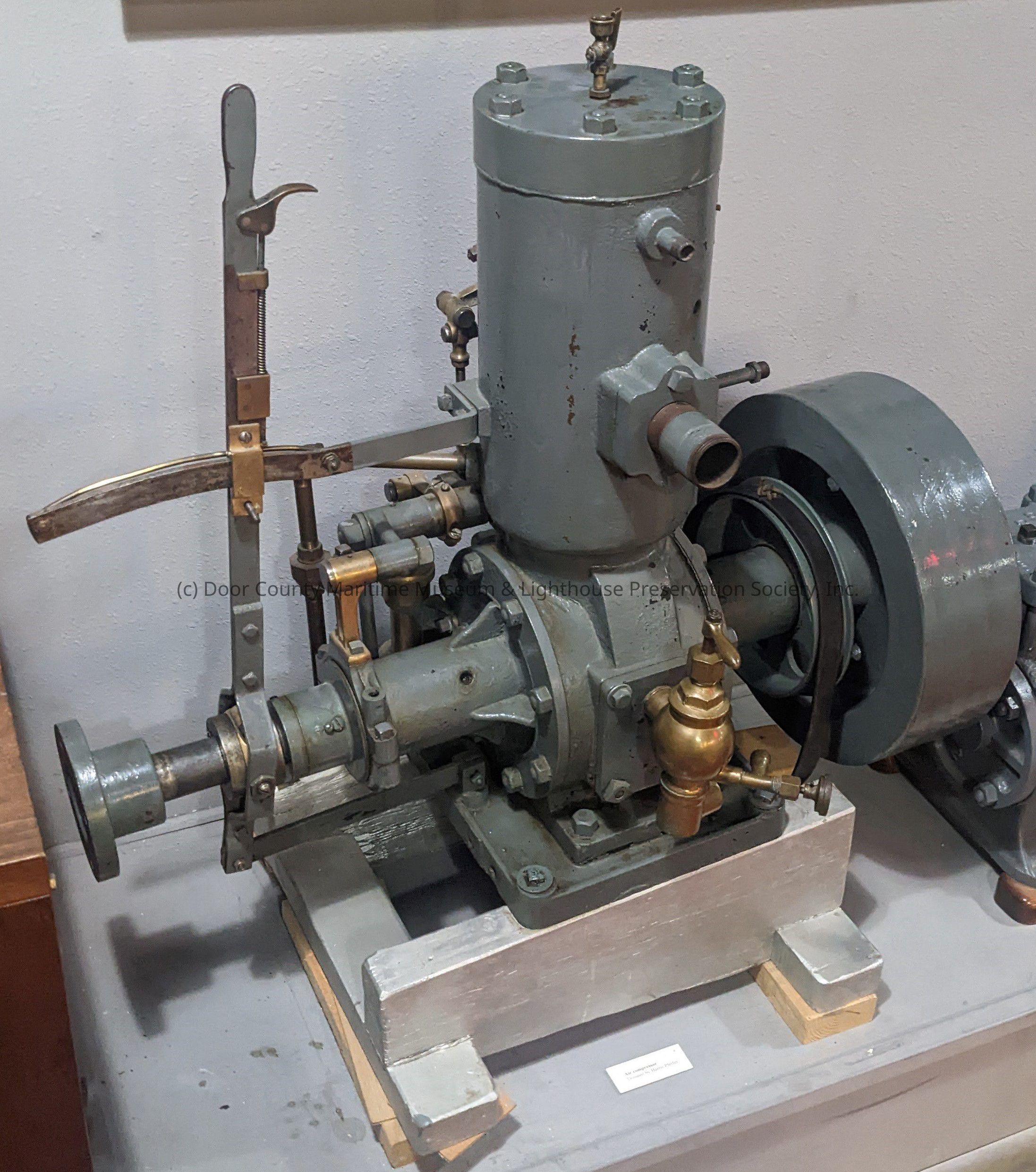 gray metal with brass fittings; main cylinder has a release valve at the top and sits above the main shaft; the manufacturing plate has been removed; an oil glass comes out of the front; an open threaded pipe to one side; guide for a lever handle at the rear and to the other side; there is a large oval opening flanked by two screws near the top of the cylinder; the large fly wheel at the front also has a belt on a wheel further in; drive shaft has a jointed pipe coming out of a collar; the shaft ends in a wheelLocation