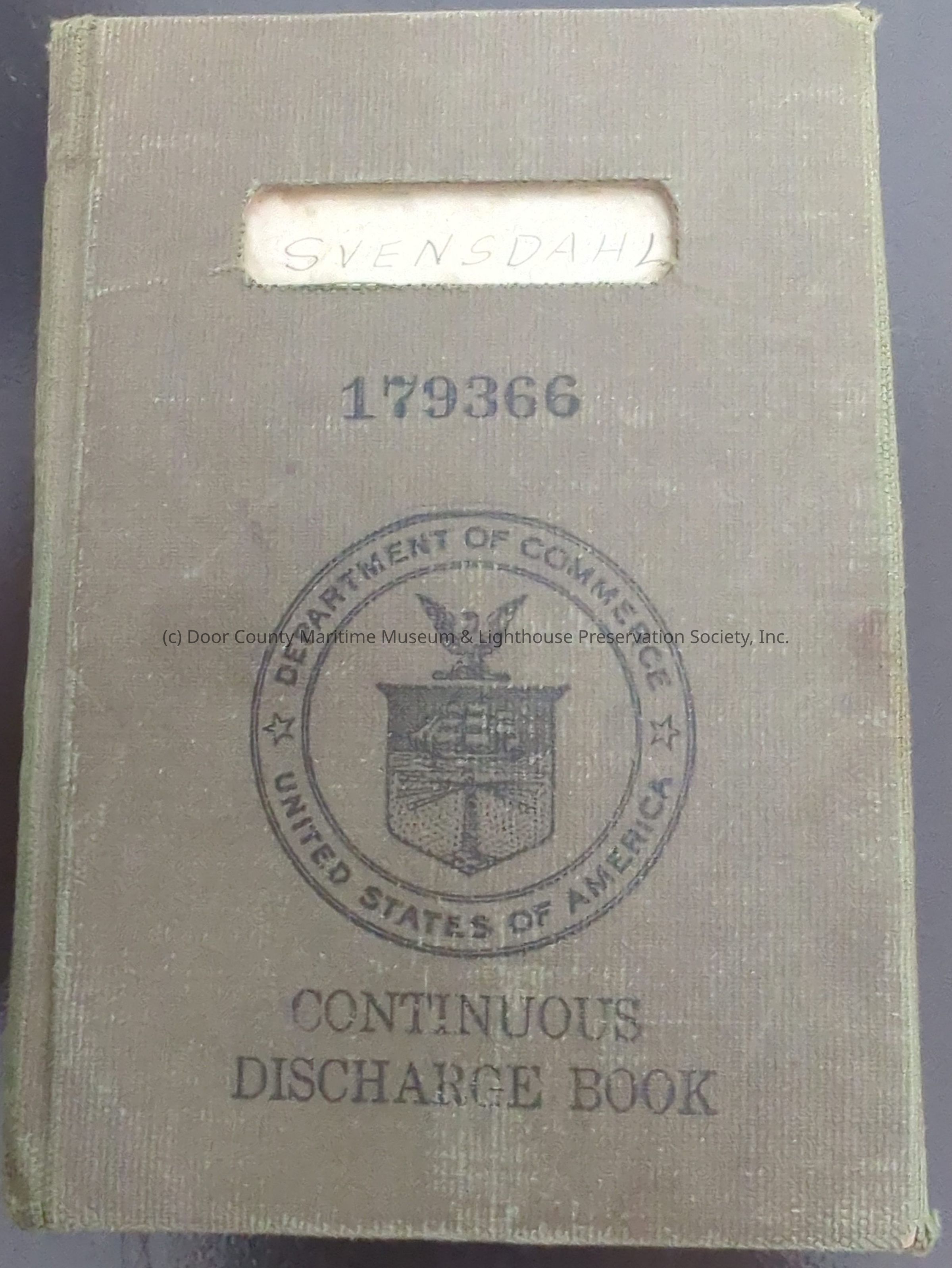 Olive green hard cover "continuous Discharge Book" 179366 for Knute Svensdahl. Lists name of ship date and place, description of voyage, date, and place of discharge. Knute Svensdahl was captain of the "John Roen Jr." and "John Roen III"Location