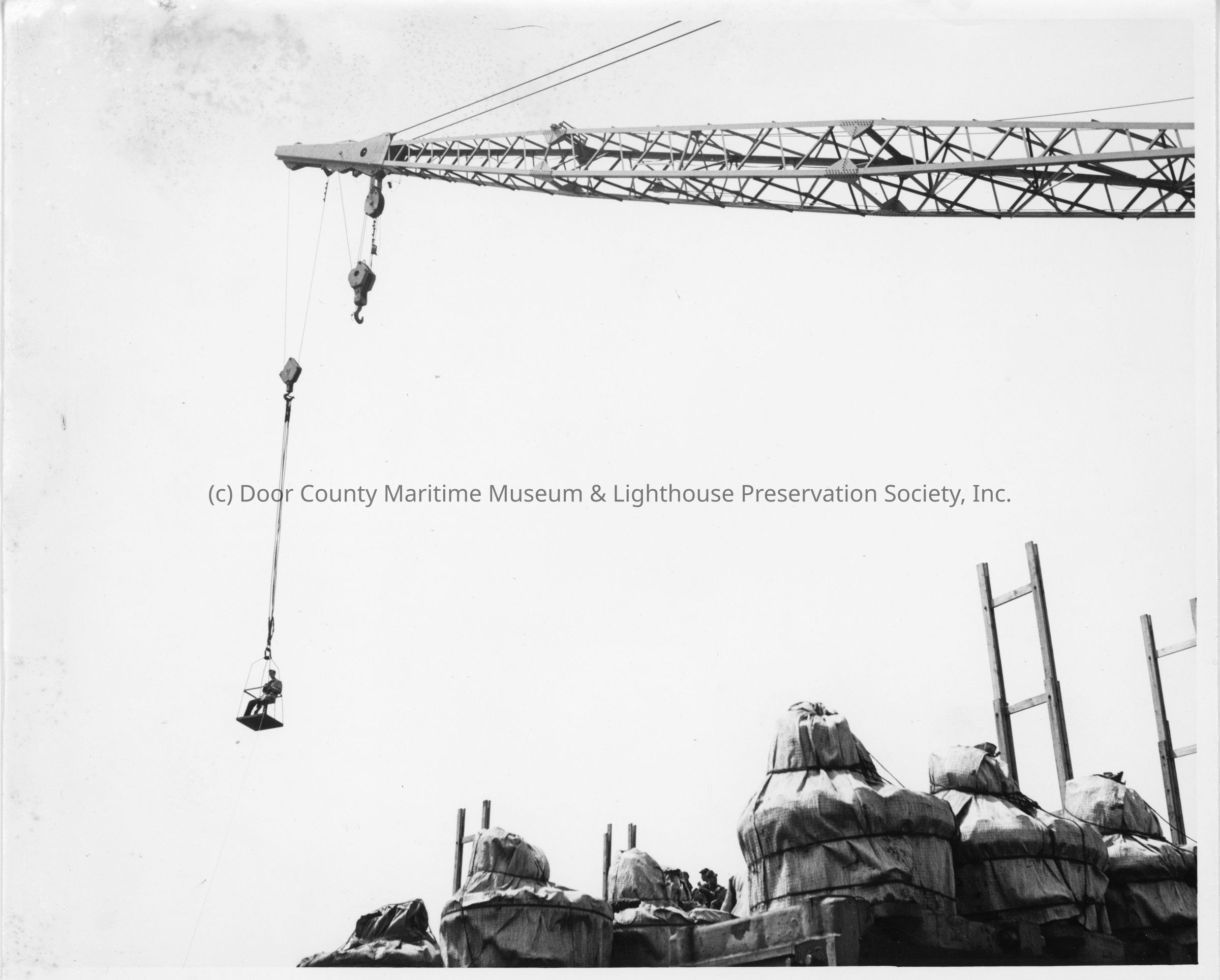 Crane at L.D. Smith Co. holding man in cage in the airEntry/Object ID