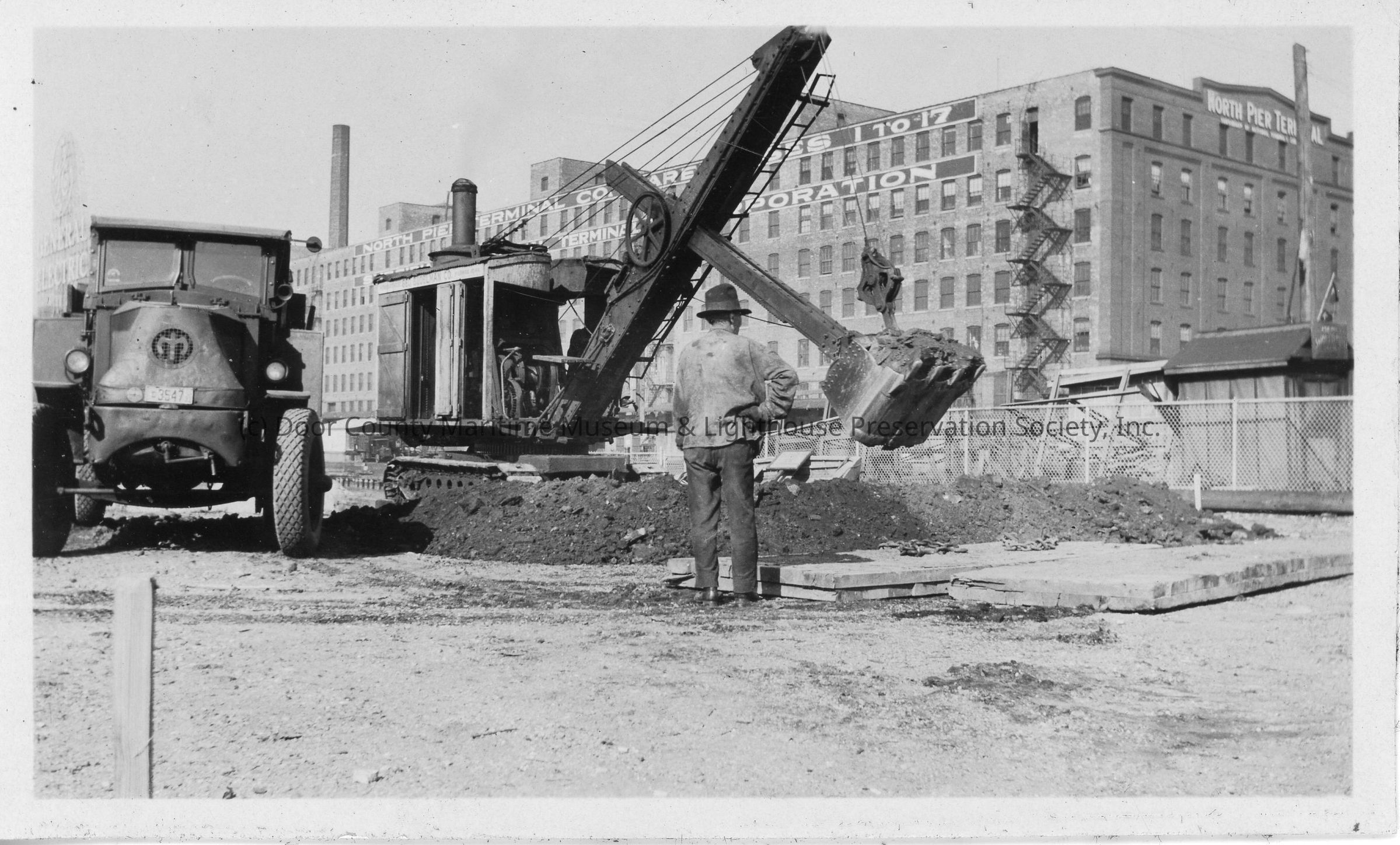 Crane digging dirt with North Pier Terminal Corpation in background