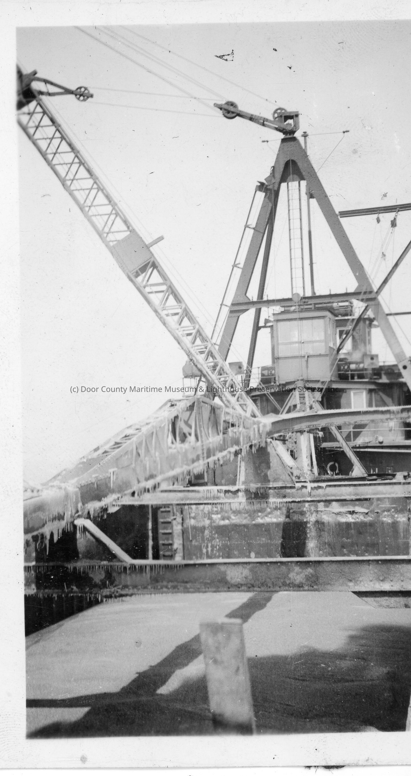 Crane on deck of ship covered in ice