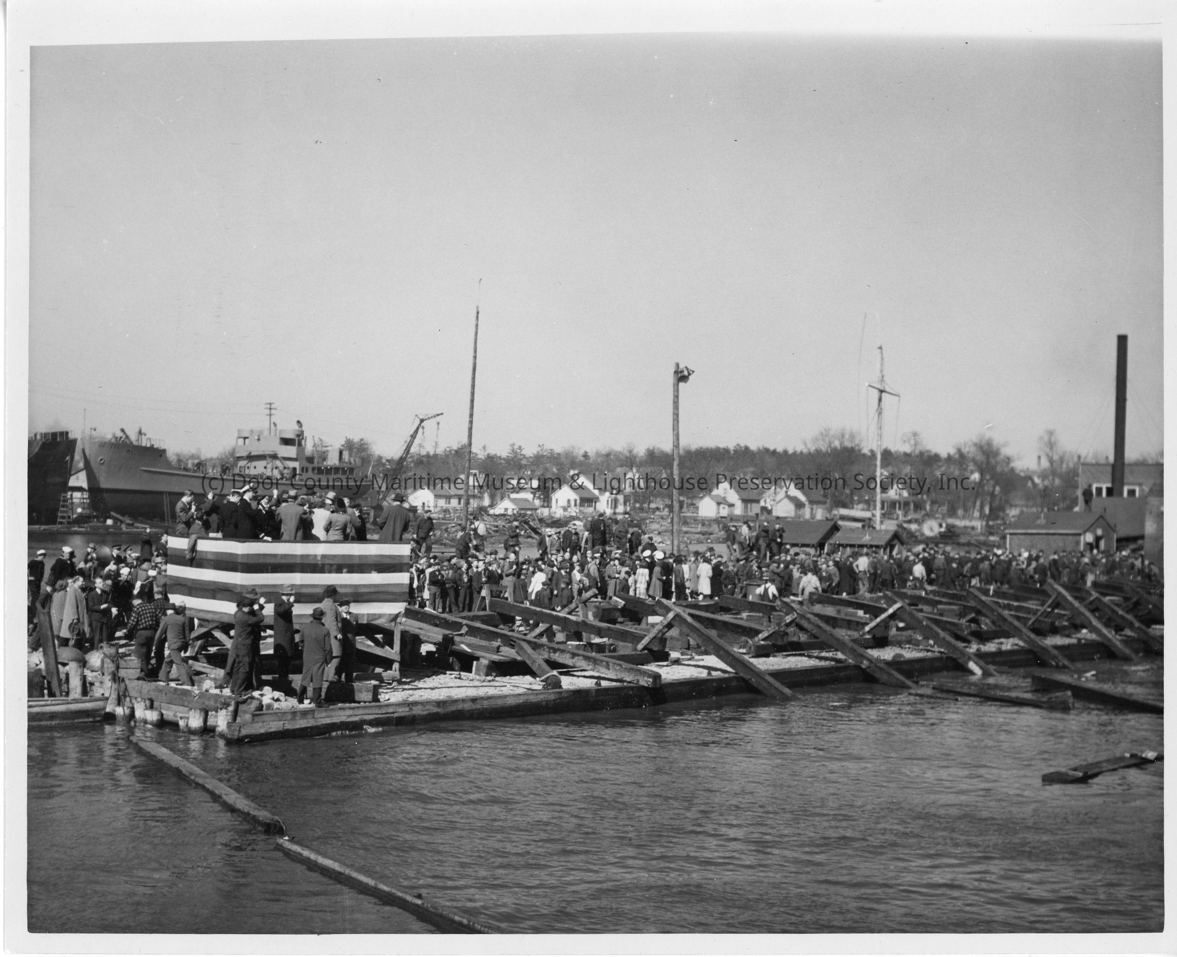 Crowd by skids after ship launching