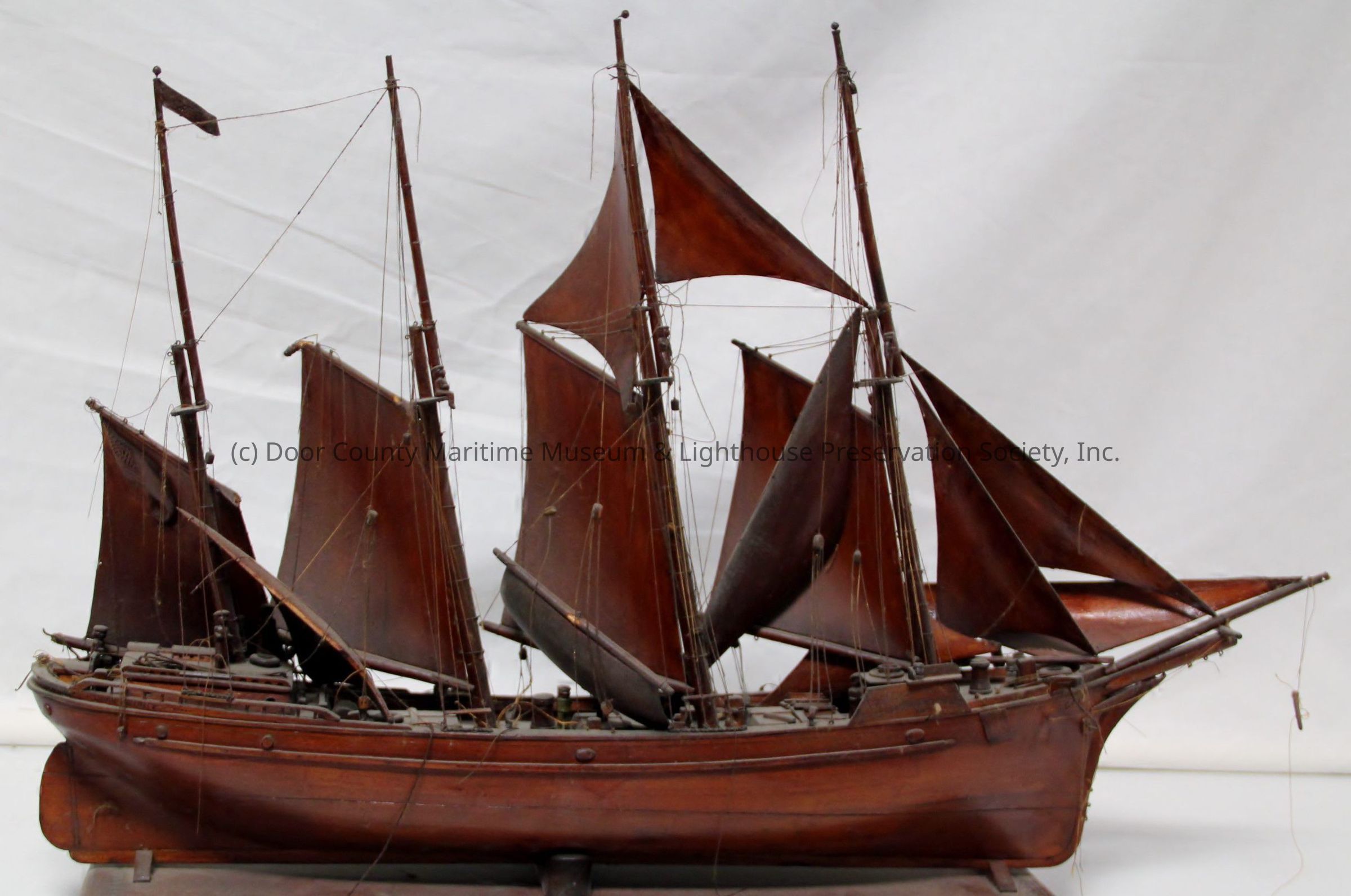 Four masted schooner; includes base; "Guaranteed A Door County Cedar Model C.D. Brower S.D. Co." sign; "Barker Lumber and Fuel;" on flag "C. of C.;" on base "Hand knife model;" worker figures