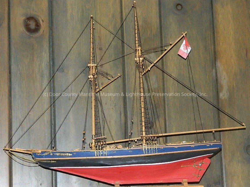 model of tall Schooner "Bluenose II;" on wood stand; red hull; above water line black; next layer is blue; deck is natural wood; tow silver life boats; Canadian flag; two masts; rigging