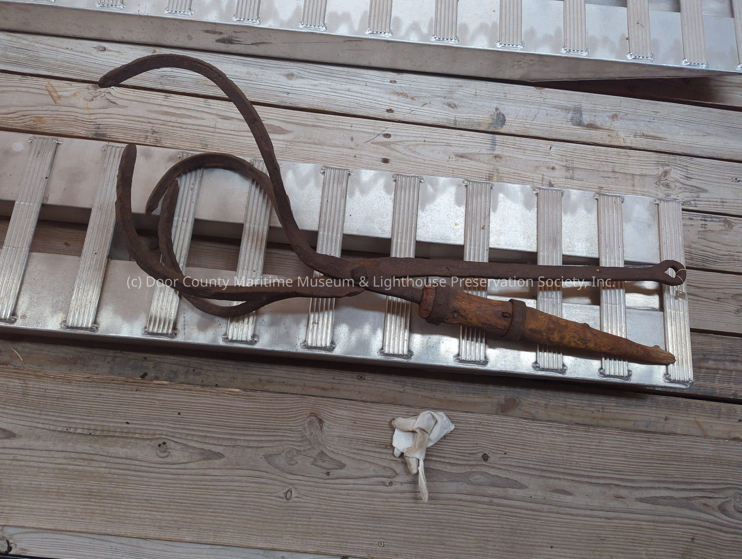 Brown wooden handle on one side. Metal straps hold wood to shaft. Metal tongs.