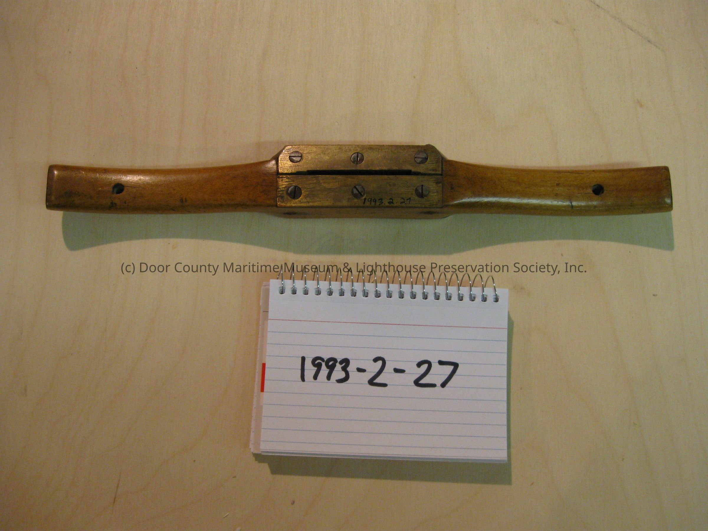 Varnished brown wood; two screws to hold blade; hole on each end of handle on top; six screws holding metal plate; blade is missing;Location