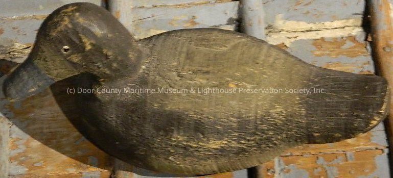 Duck decoy; clear & black glass eyes; bluish bill; metal bracket on bottom; wood dirty and scratched.