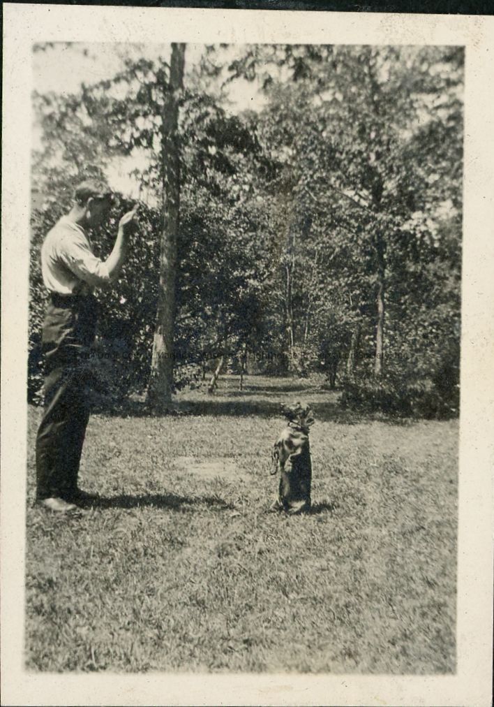 An unidentifed young man gets a dachshund to sit up on its hind legs.