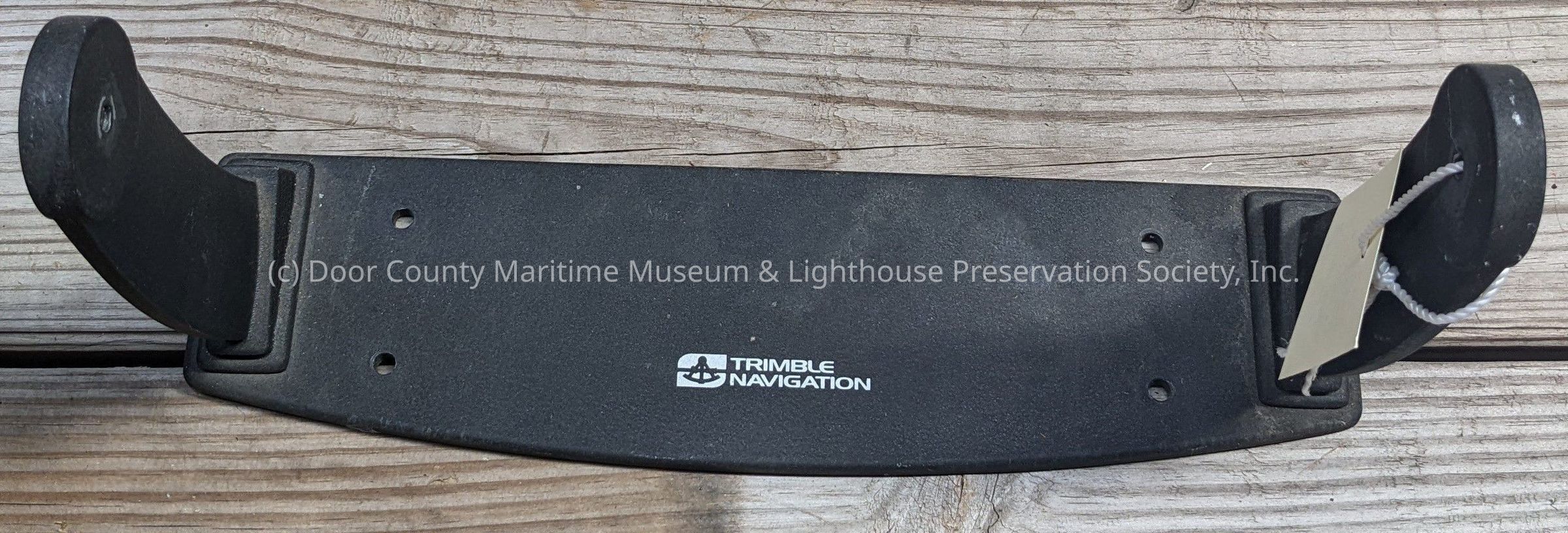 Chart plotter display unit; overall color black; gray power cord; metal support bracket allows unit to pivot viewing angle; face of unit has 38 soft buttons in various shapes located below the 6"x9" viewing screen; top right face copy "Navgraphic II Loran"; back ID label Ser. # 2920A00231; model #13182-01.