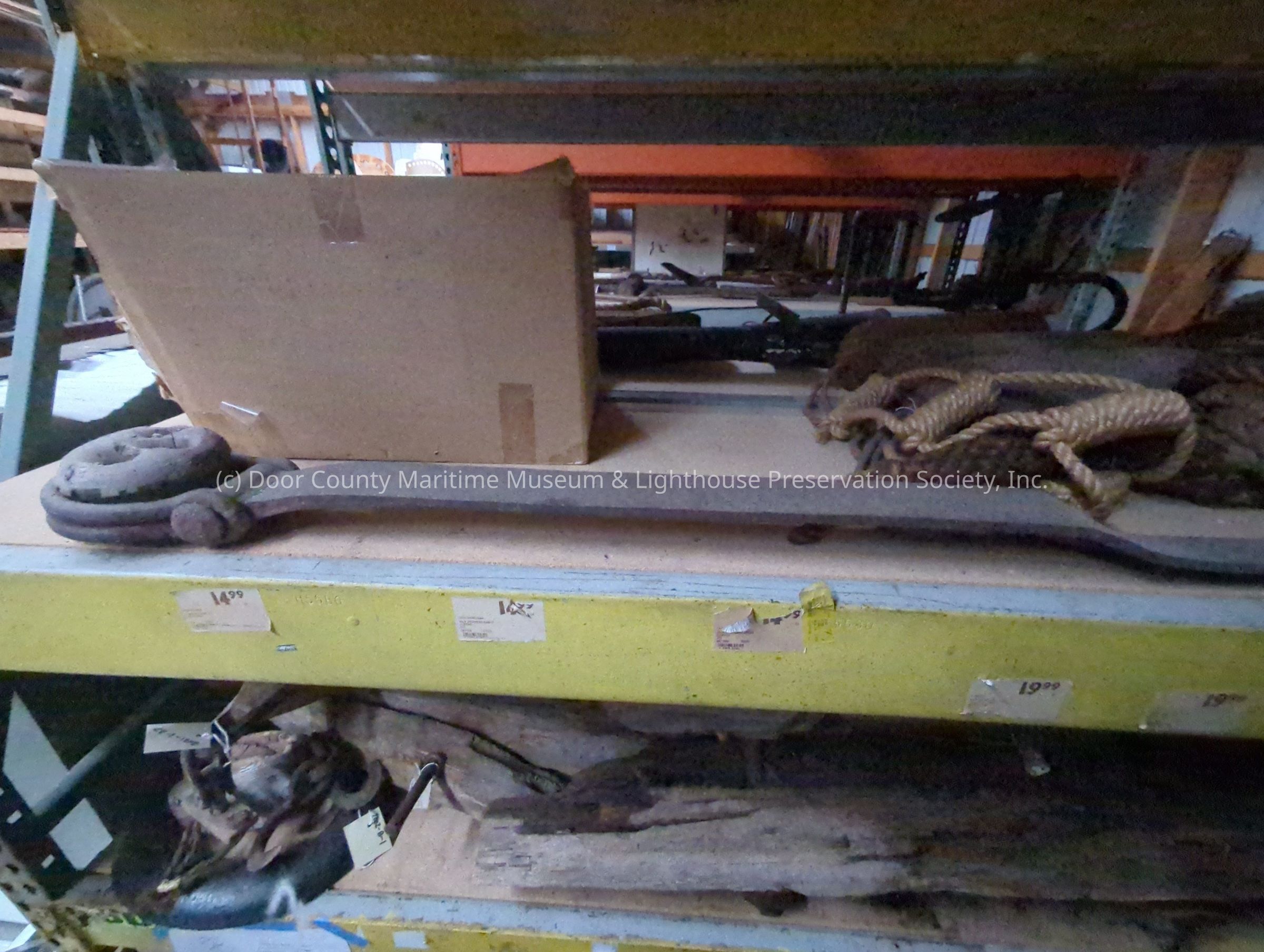 Rusty metal holder with two holes near end. Wooden dead eye with three holes