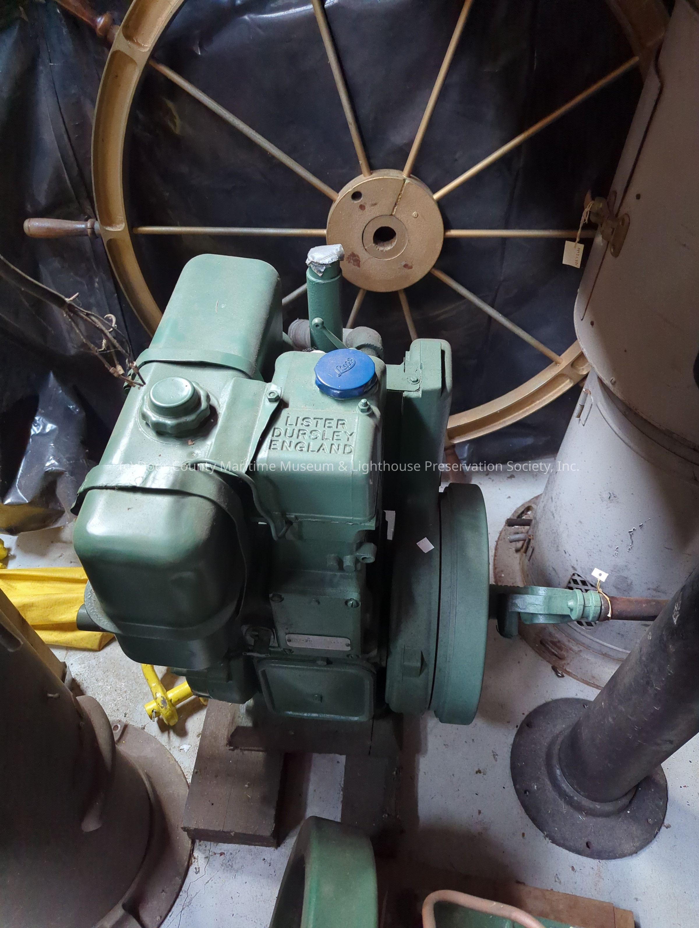 Light green engine with blue gas cap. On wooden stand. Wheel has varnished wooden handle.