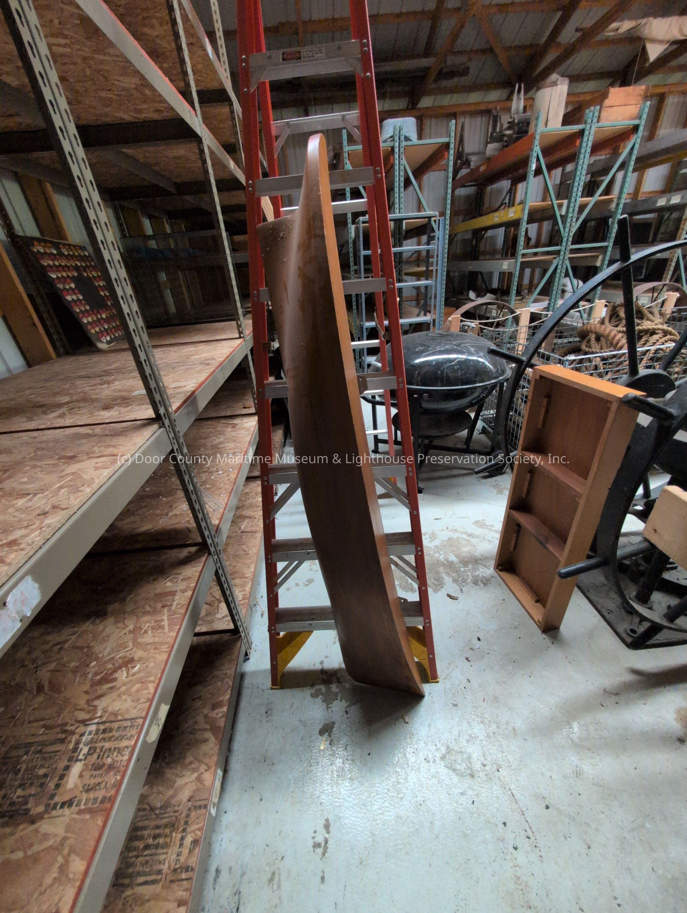 Brown varnished pencil lines on wooden half hull model. Two metal brackets on back. "SBSB&DD Co., 1944--45-USATC 85 ft. Tugs 10 built" printed in pencil on back