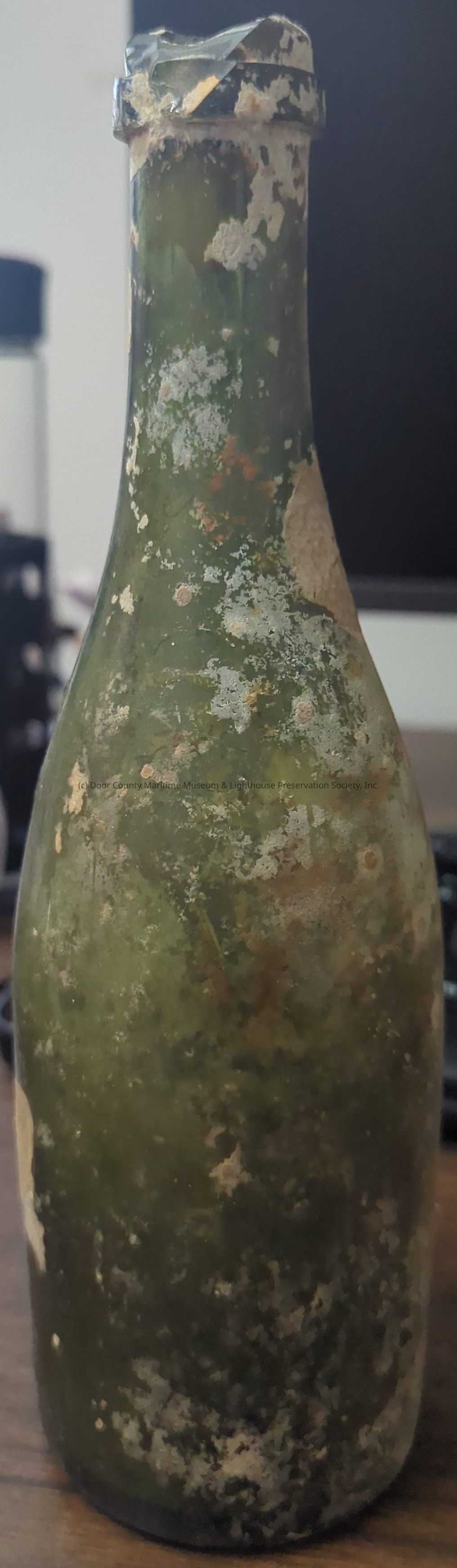 Dirty green glass bottle with broken rim. Covered in dry white substance. Concave bottom