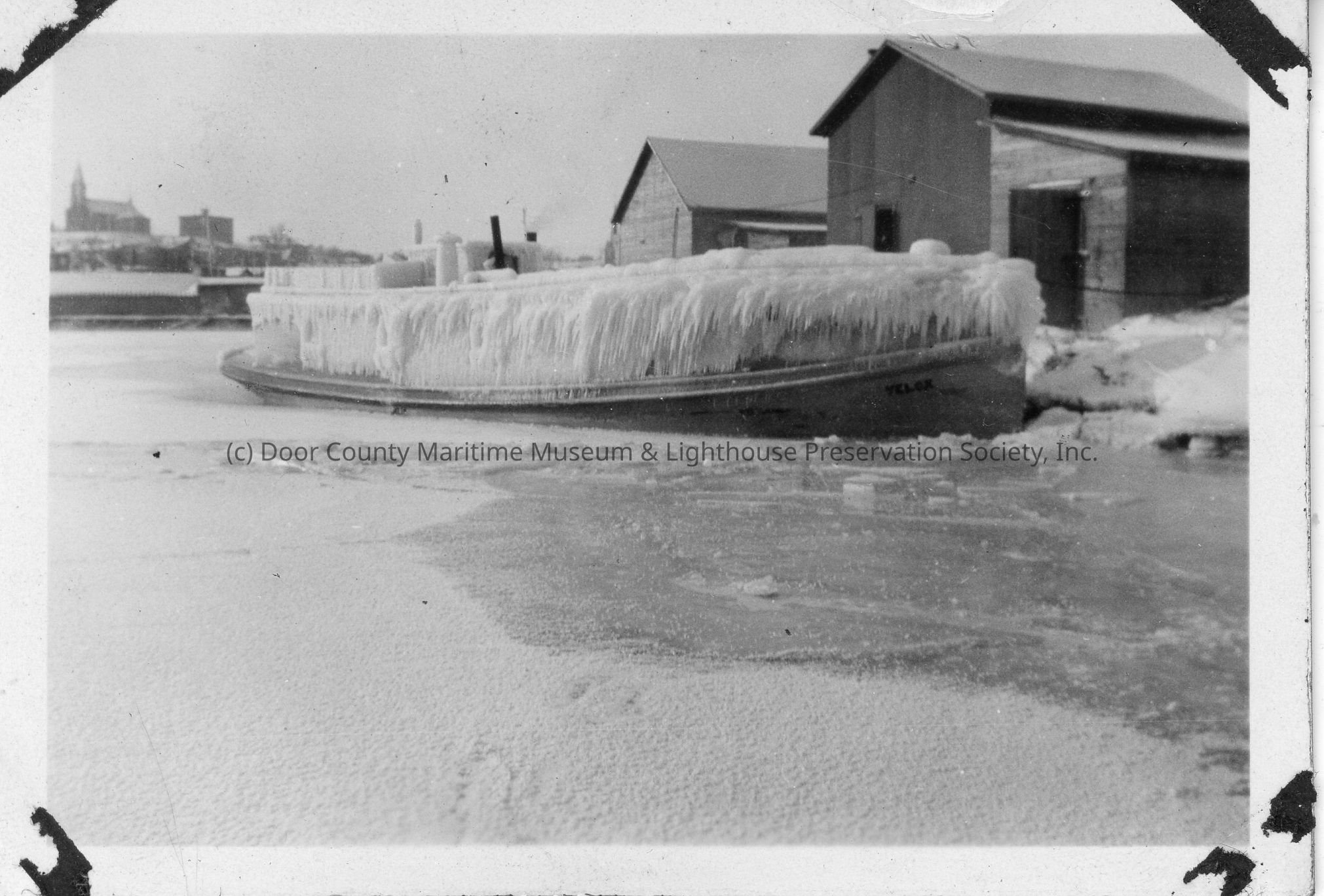 Docked fishing tug Velox covered in ice
