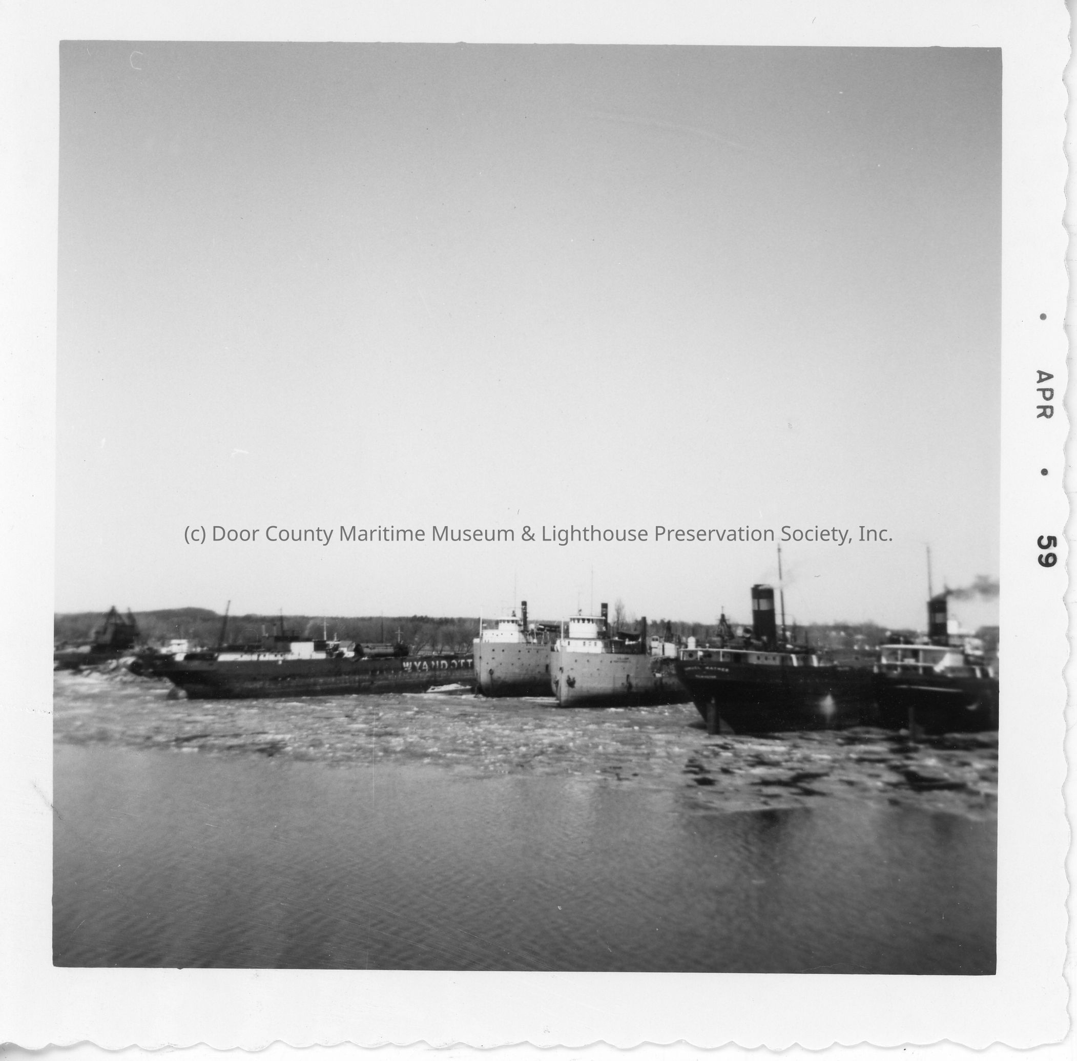 Docked vessels in winter with one belonging to L. Wyandotte Chemicals April 1959