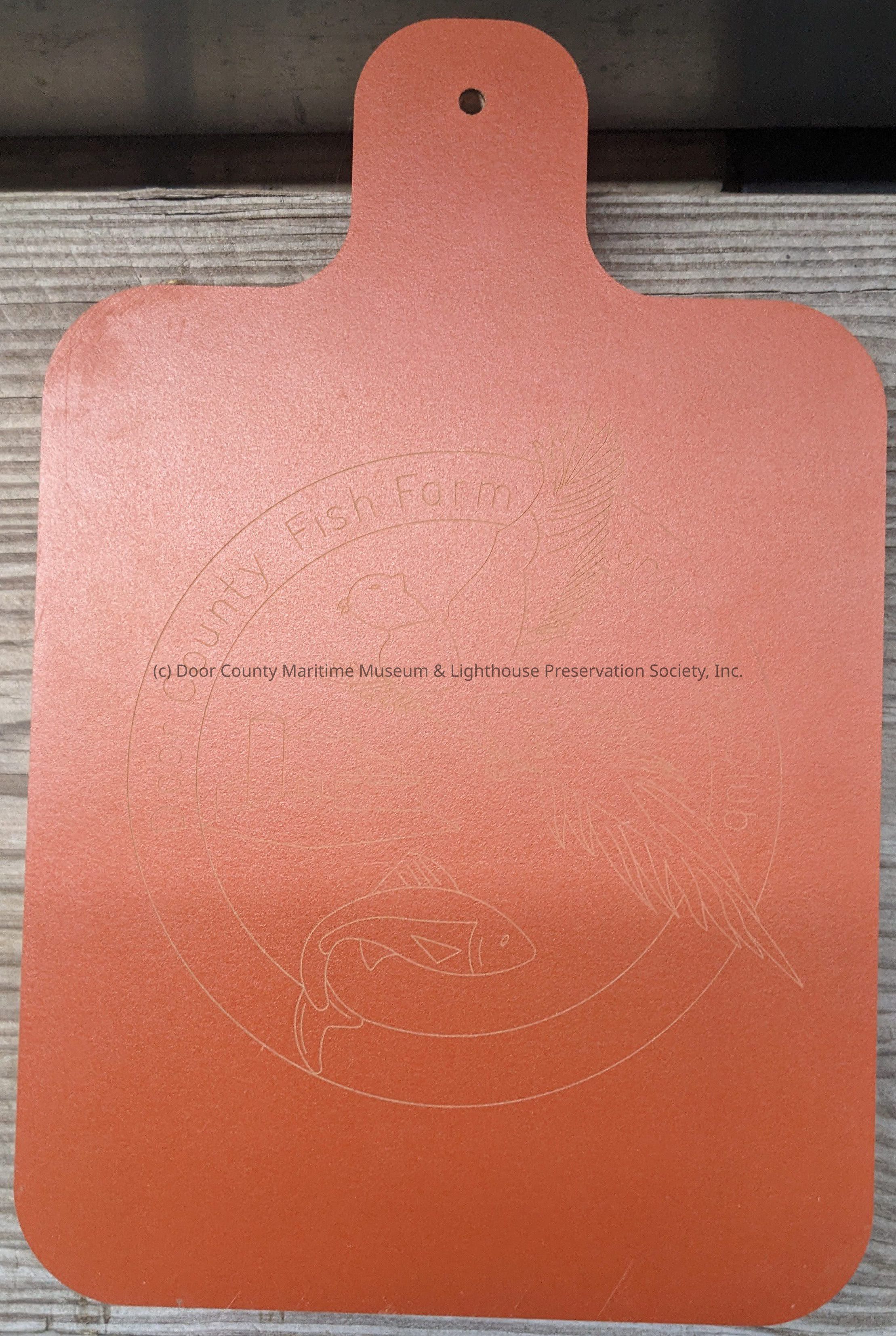 Brown Cutting board with text and picture of a pheasant, fish, and a barn