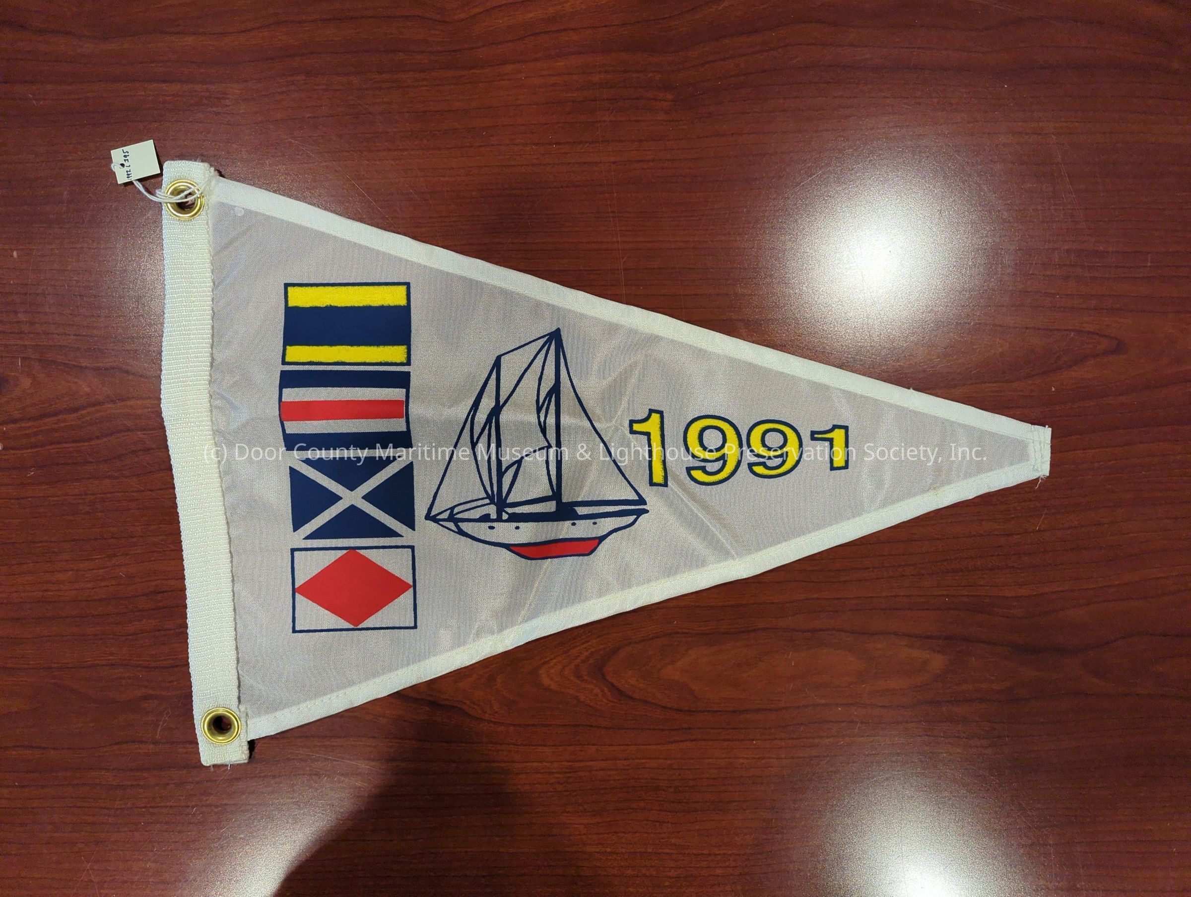 Pennant: Door County Maritime Festival 1991; triangular; white background; sailboat in red, white, and blue; signal flags "D" "C" "M" "F"; two metal eyelets on one end for hanging.Location