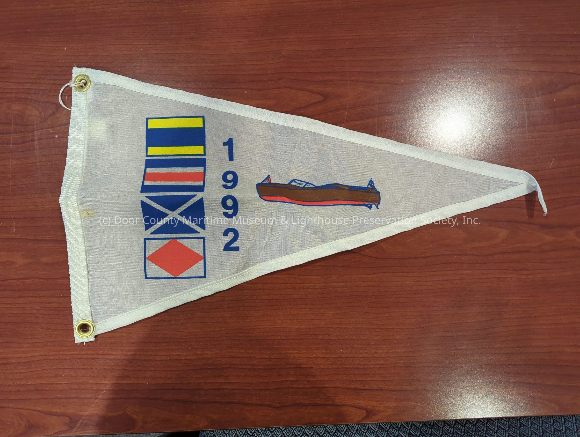 Pennant: Door County Maritime Festival pennant 1992; triangular; white background; signal flags "D" 'C" "M" "F"; brown, blue, red pleasure craft; two metal eyelets on one end for hanging.Location