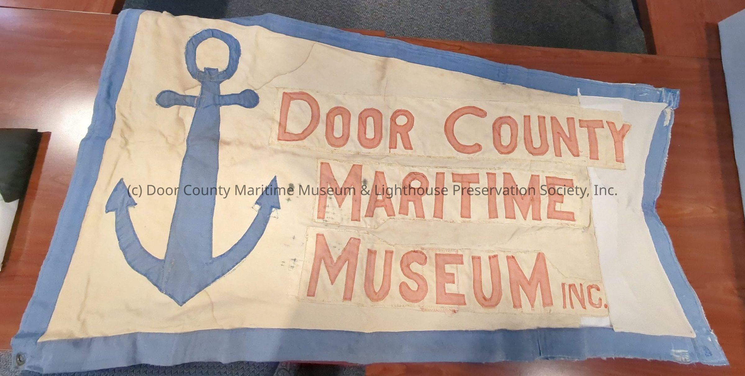 Flag: (sewn) white background; blue edging and anchor; red "Door County Maritime Museum"; white textile lining; two metal eyelets on one end for hanging; worn, faded, dirty, torn in places.Location