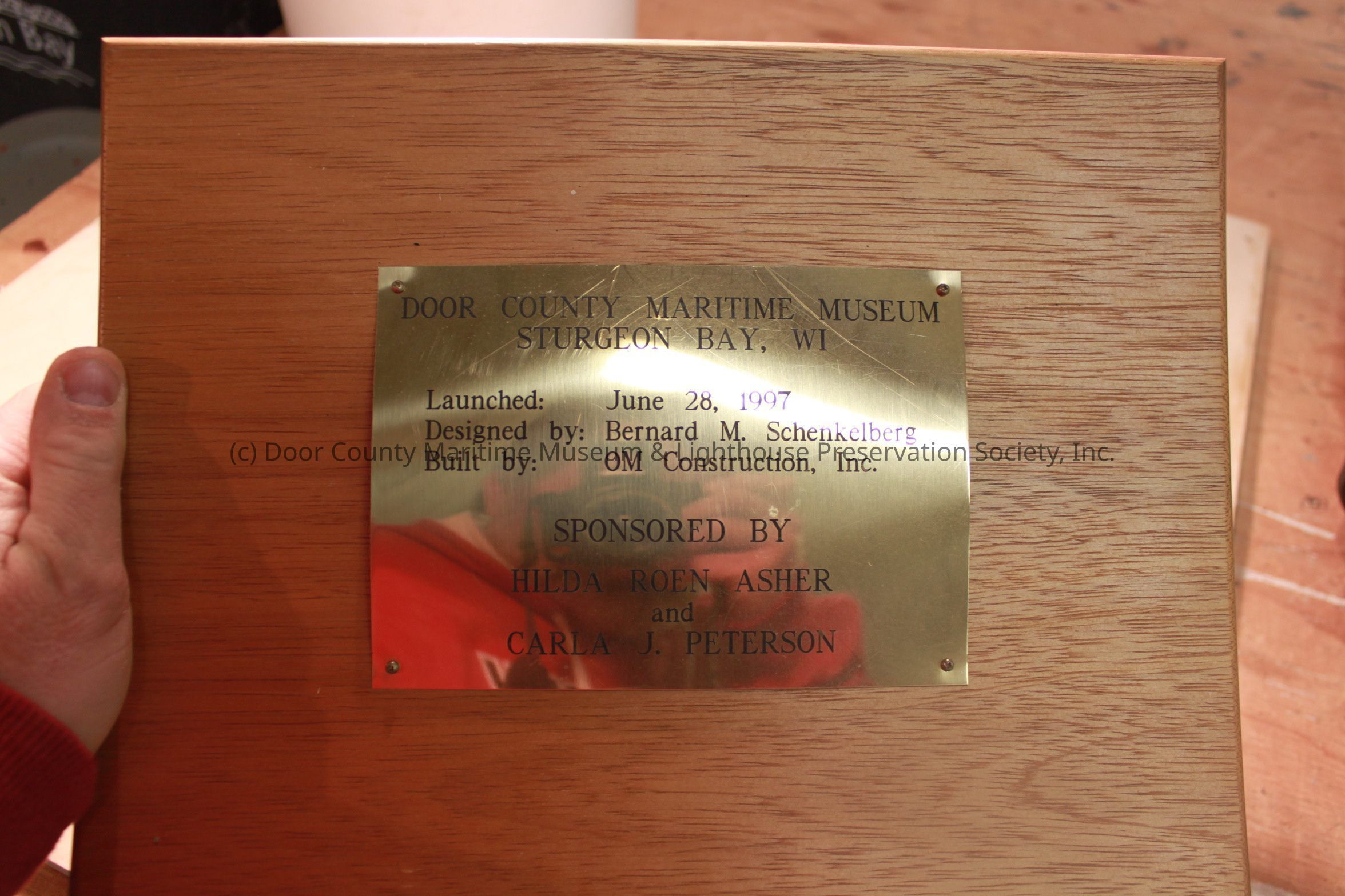 Commemorative case (sponsor box); (A) varnished wood, (top is warped); gold metal plate fastened to top of hinged cover; "Door County Maritime Museum, Sturgeon Bay, WI, Launched: June 28, 1997, Designed by: Bernard M. Schenkeberg; Built by: OM Construction, Inc. Sponsored by: Hilda Roen Asher and Carla J. Peterson"; inside: divider down center, making two sections; each section contains: (B) & (C) bottle remnants of a green champagne bottle, encircled in rope and laced with red, white, and blue ribbon;