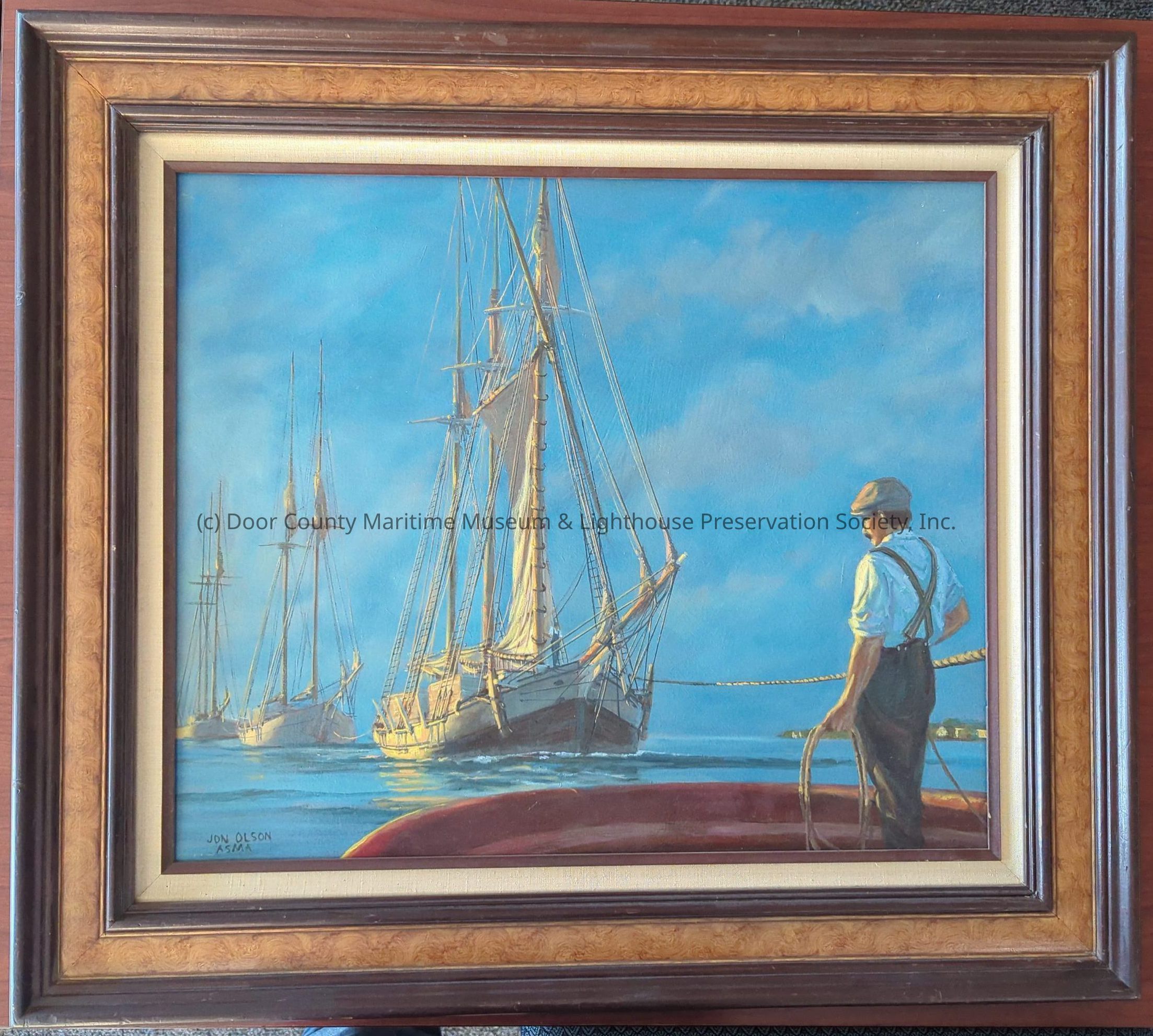 Oil Painting in brown and white frame. Depicts man standing on stern of a vessel that is towing three ships behind it
