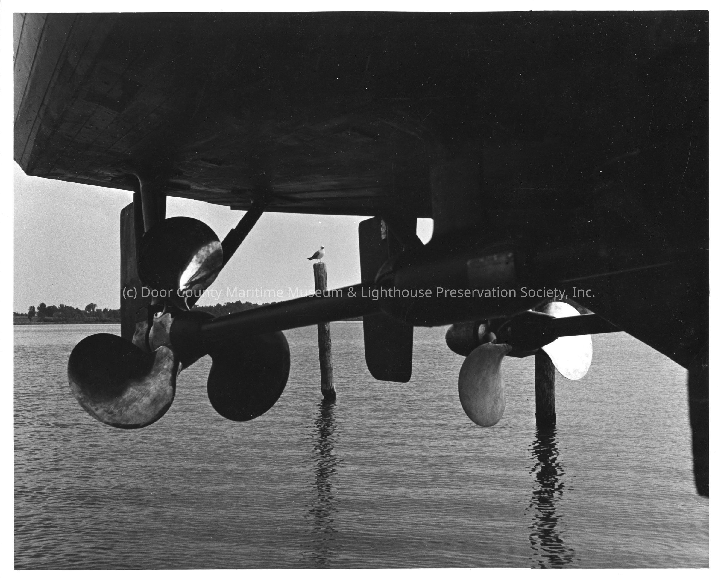 Dual propellors and rudder on underside of PC-644 at Peterson Boat Works July 26, 1942