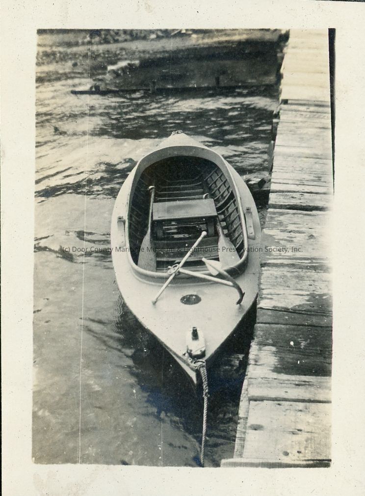 Duckboat tied to pier with oars inside. Identified in album as My Duckboat