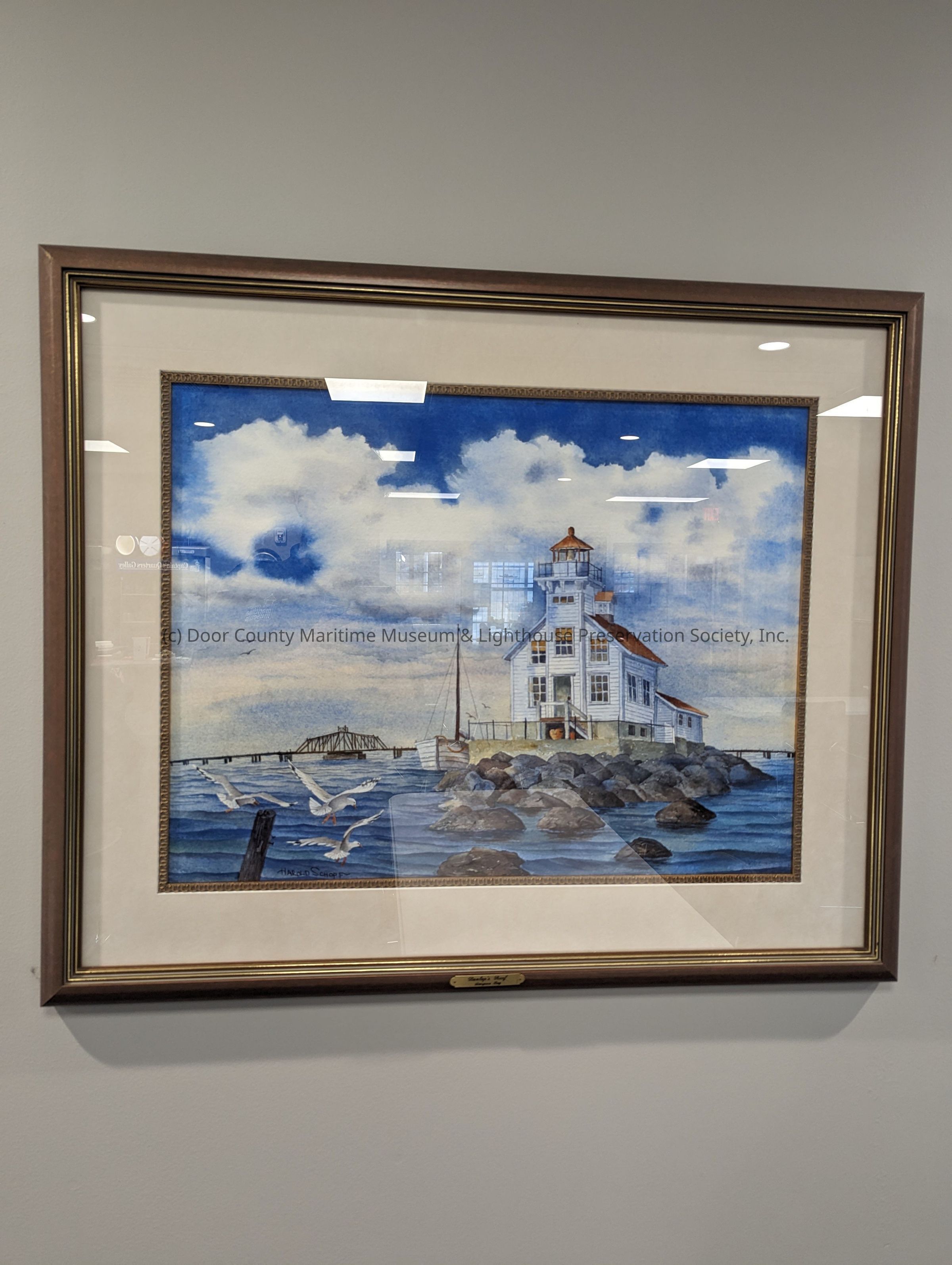 Framed watercolor painting depicting Dunlap Reef Lighthouse