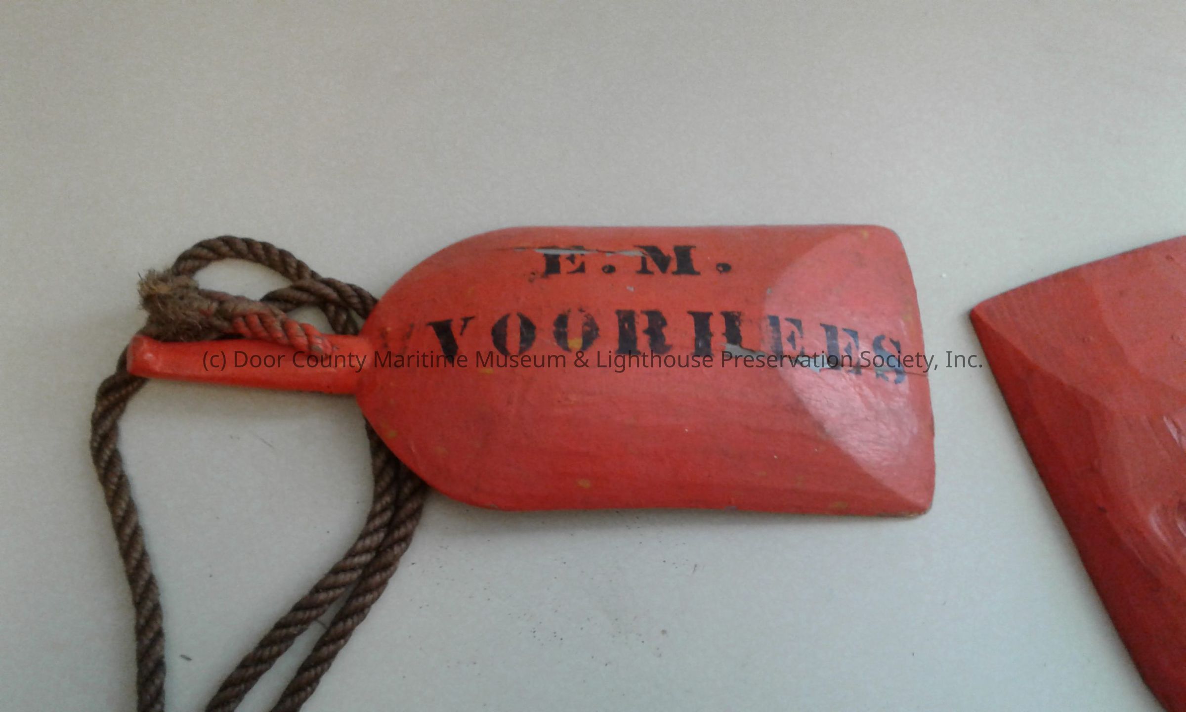 Orange wooden bailer with black text "E.M. Voorhees". Rope attached to handle