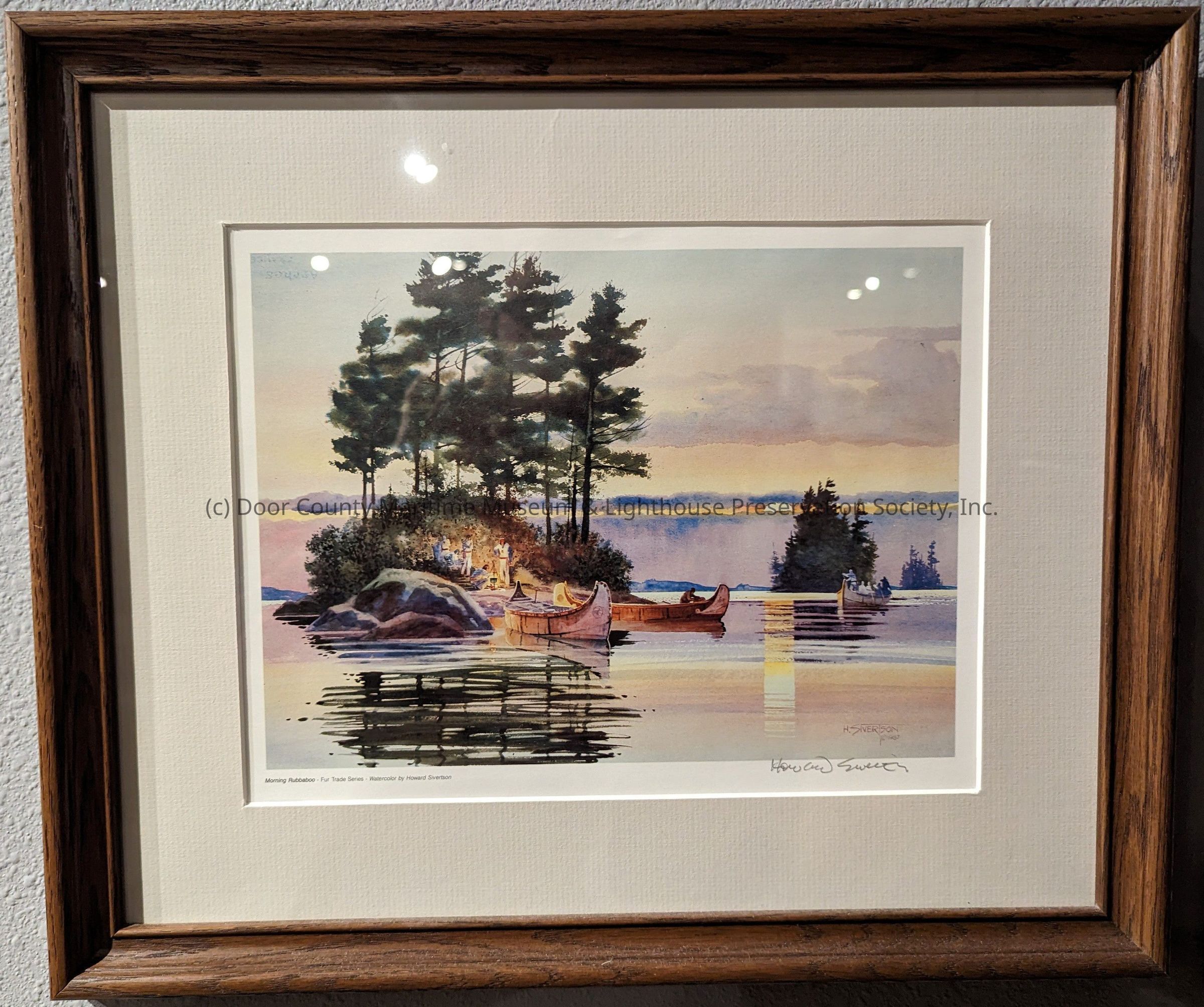 Print of a watercolor "Morning Rubbaboo" by Howard Sivertson - Fur Trade Series; brown wood frame; glass; grayish mat; white border; autographed by artist in bottom right corner; wire hanger; framed by Harold Schopf.Location