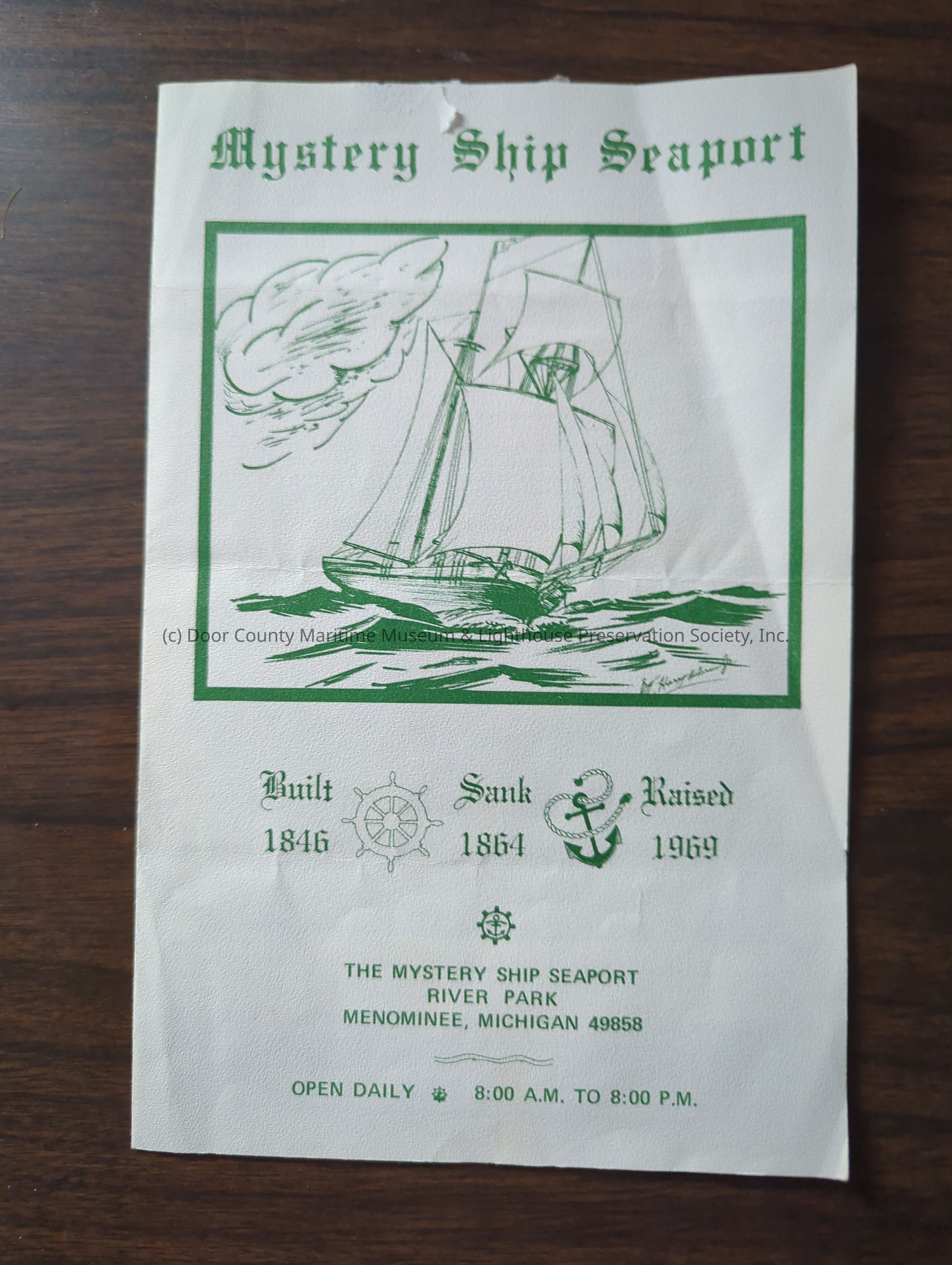 Brochure for the mystery ship seaport in Menomonee, Michigan