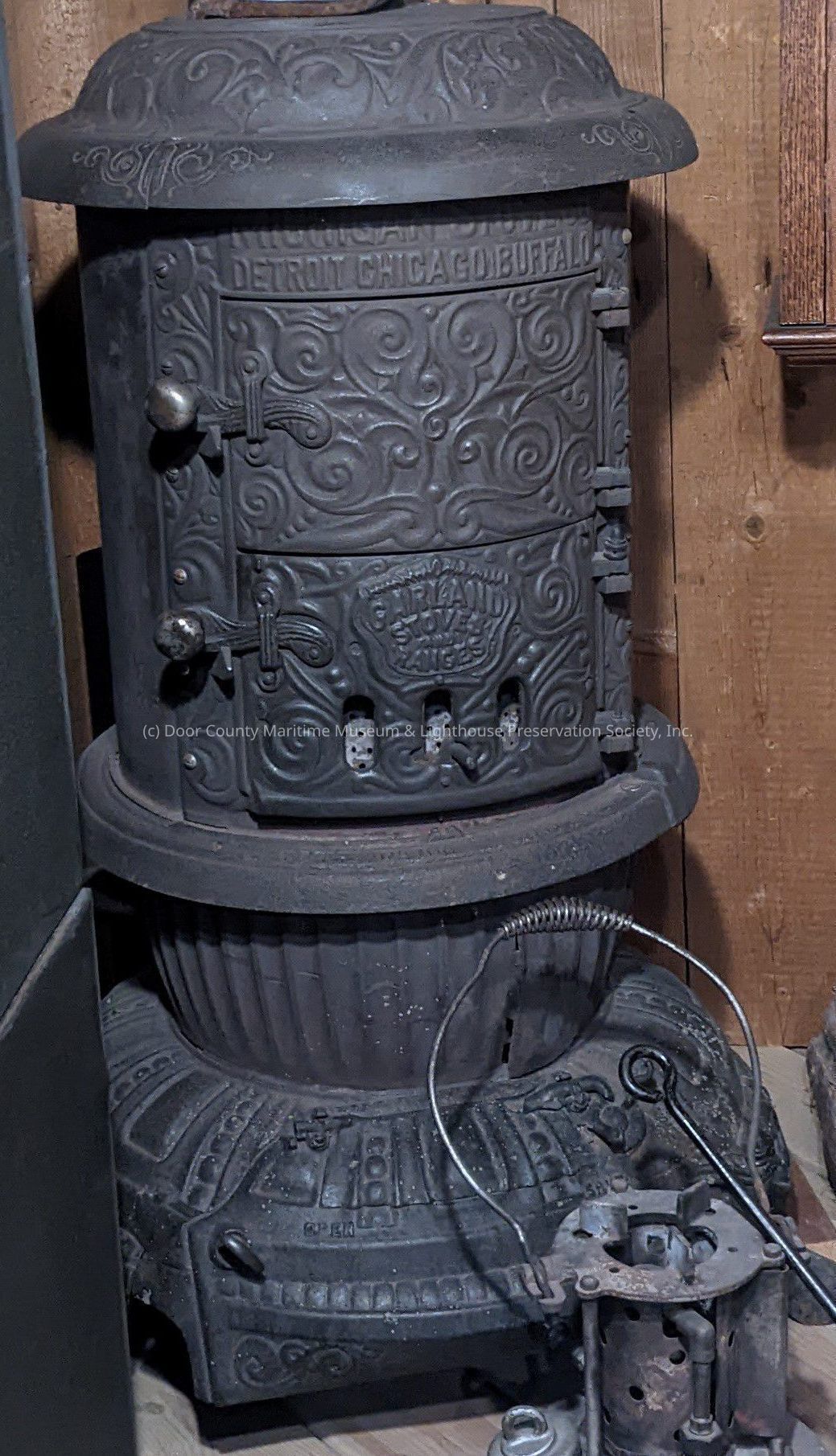 Pot belly stove (woodburning) : blackish-brownish; two front doors (one on top of another) for wood; stands on 4 feet; very decorative imprinting on stove doors & top; linear imprints on base; vents that read "open" (left side) & "shut" (right side) on base of stove; smooth sides on middle part of stove; small lid on top that opens to inside of stove;Location