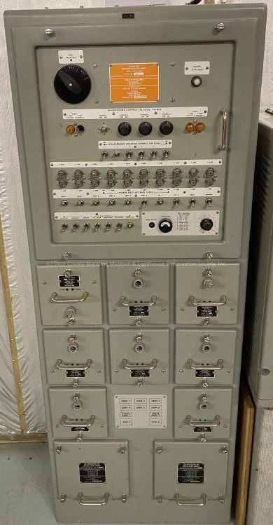 Amplifying system from MCM-1; Serial #AJ1; manufactured for Naval Sea Systems Command; gray; orange metal I.D. plate near top; 3 rows=total 23 silver metal switch knobs; 2 rows (10 each) 10 amp. fuses with clear plastic covers; 10 "drawers" with silver handles and black metal I.D. plates; several fuses missing; two gray ventilation panels on each side.