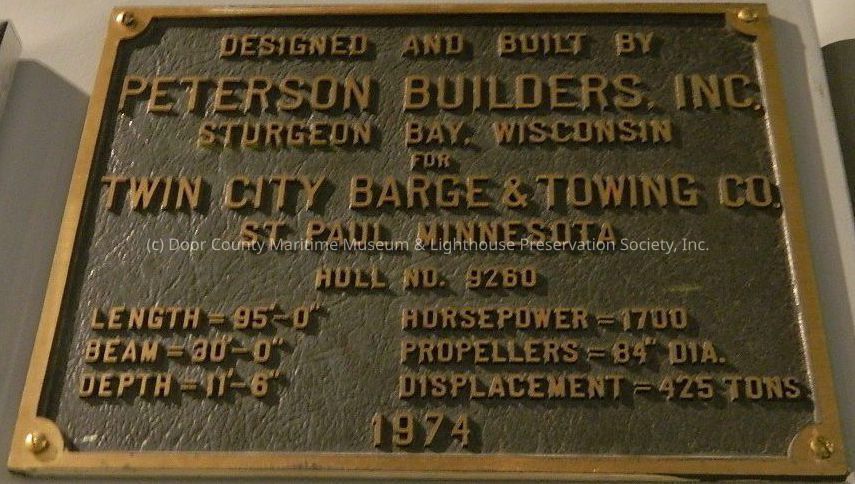 Metal nameplate; gold edging and printing; black background; "Designed and Built by Peterson Builders, Inc....for Twin City Barge & Towing Co., etc.; Hull no. 9260 etc.Location
