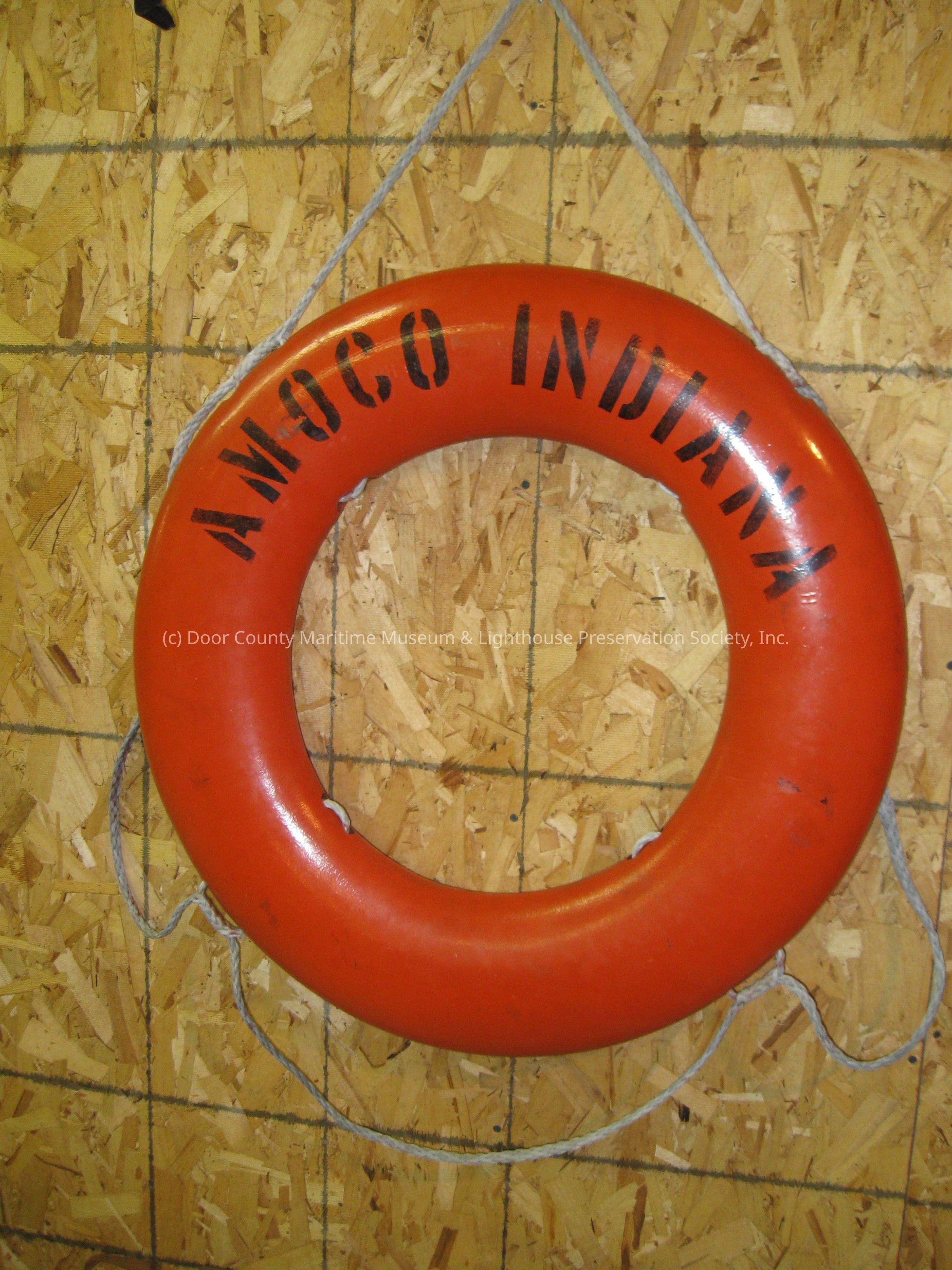 Orange life ring; black print AMOCO INDIANA; gray rope around circumference.