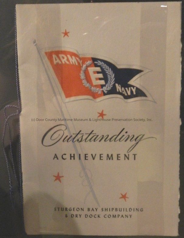 White paper; dark blue print; program for Army Navy E Outstanding Achievement, Sturgeon Bay Shipbuilding & Dry Dock Co; blue cord fastener on left side; April 20, 1944.Location
